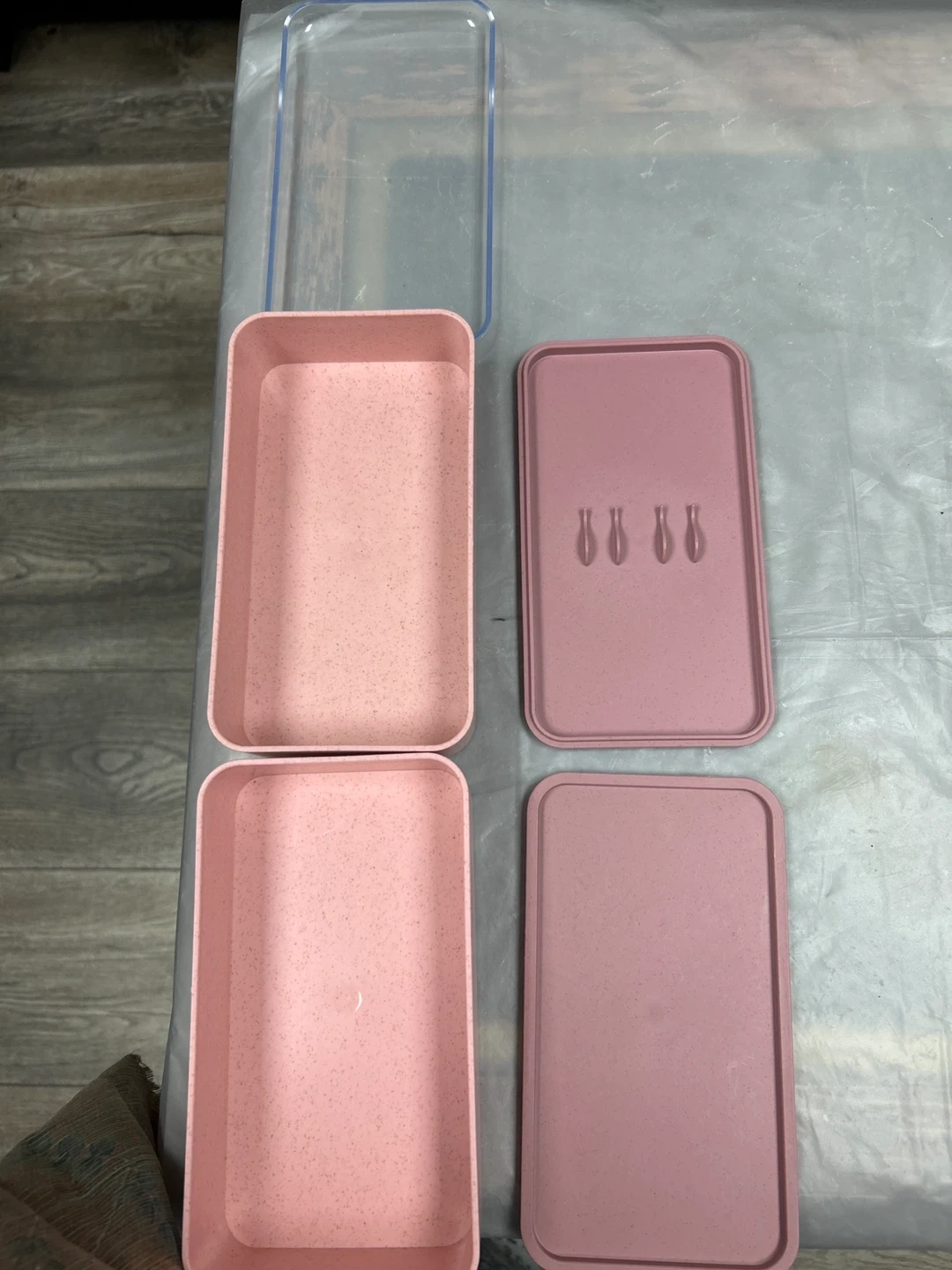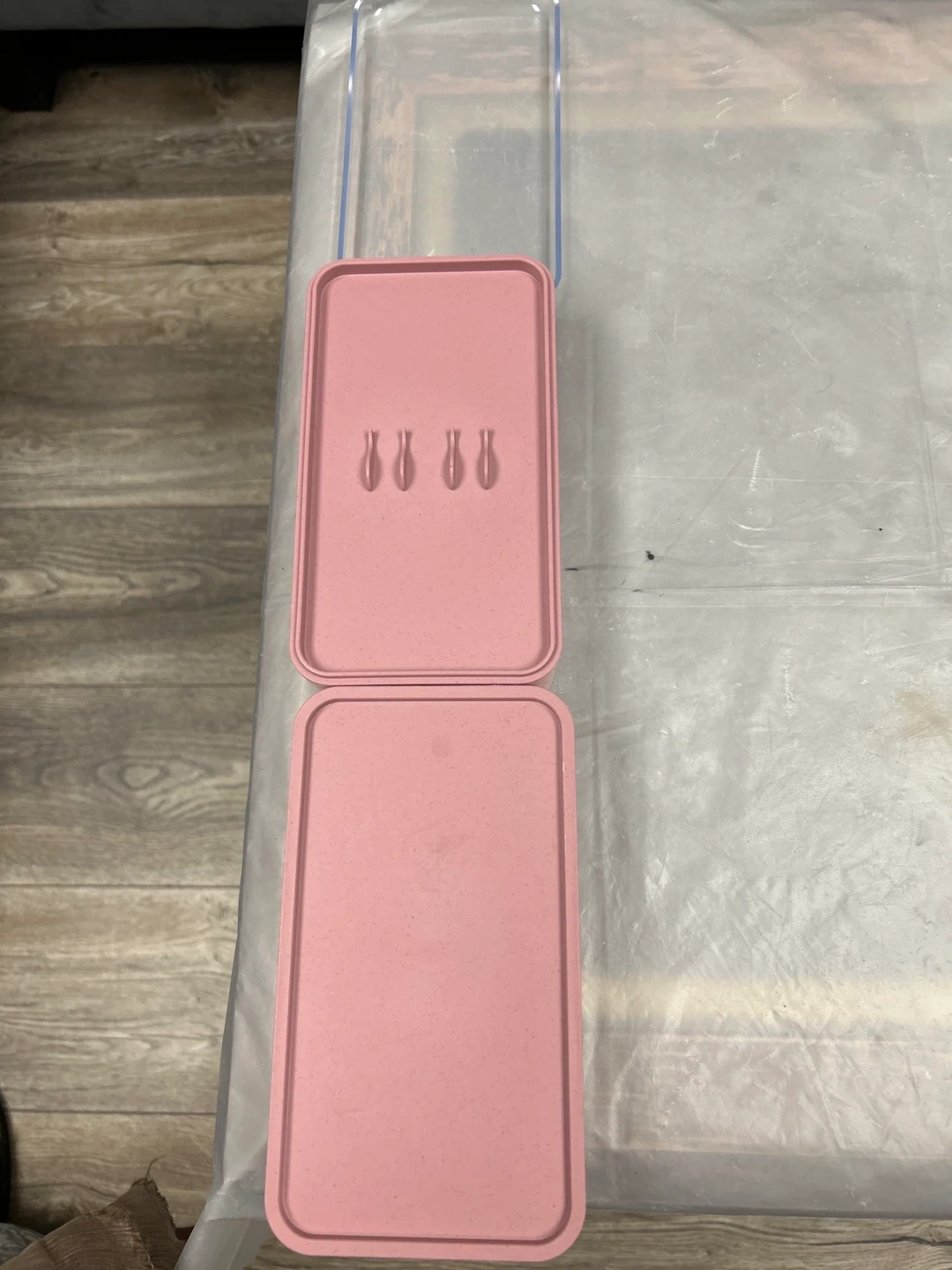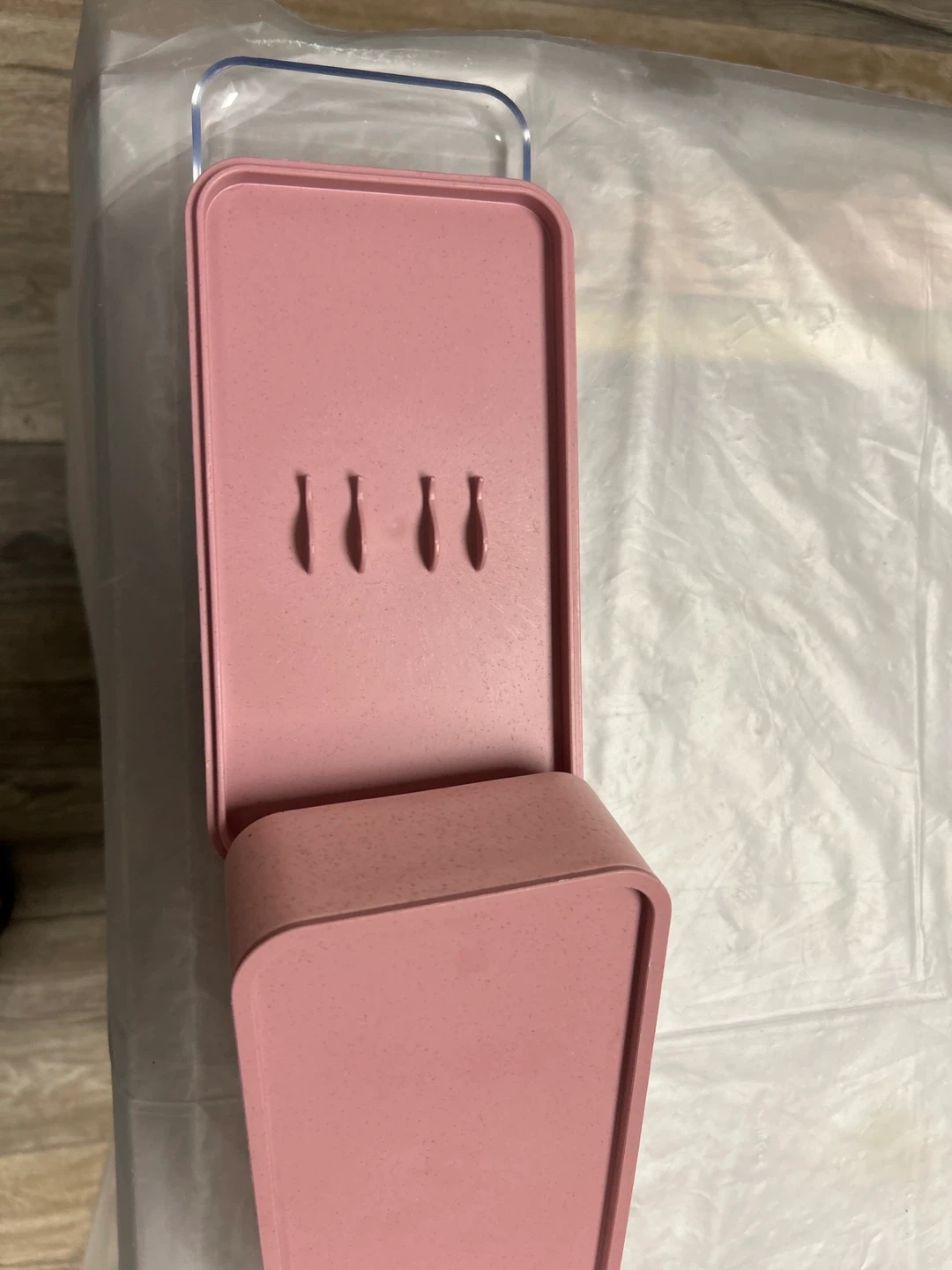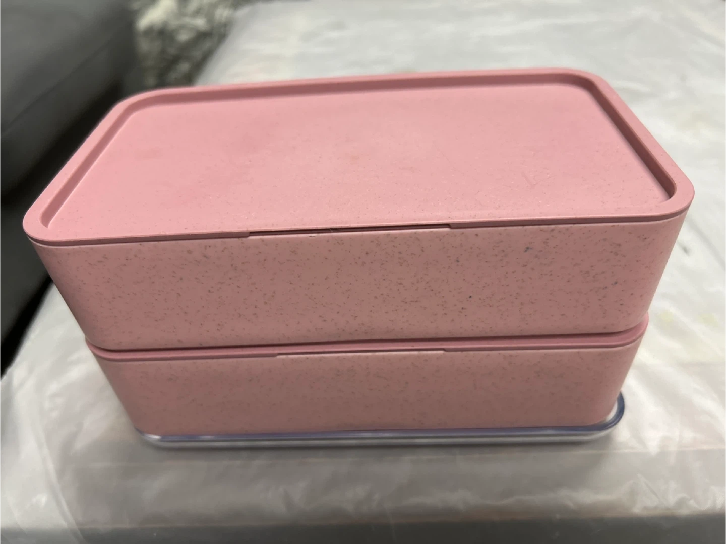 Pink stackable lunch box with two compartments. It comes with a lid featuring utensil holders. The containers are made from a wheat straw composite material.