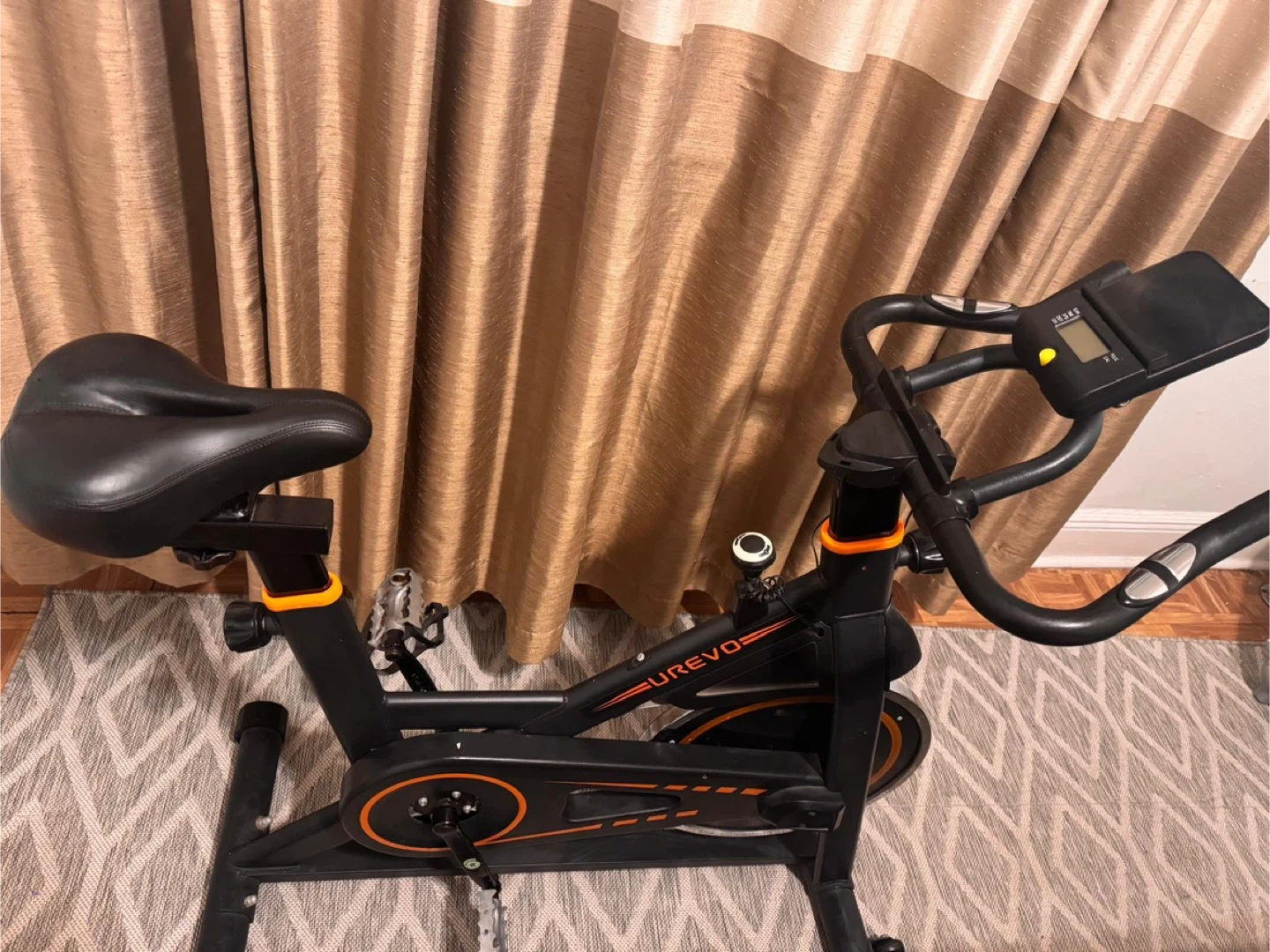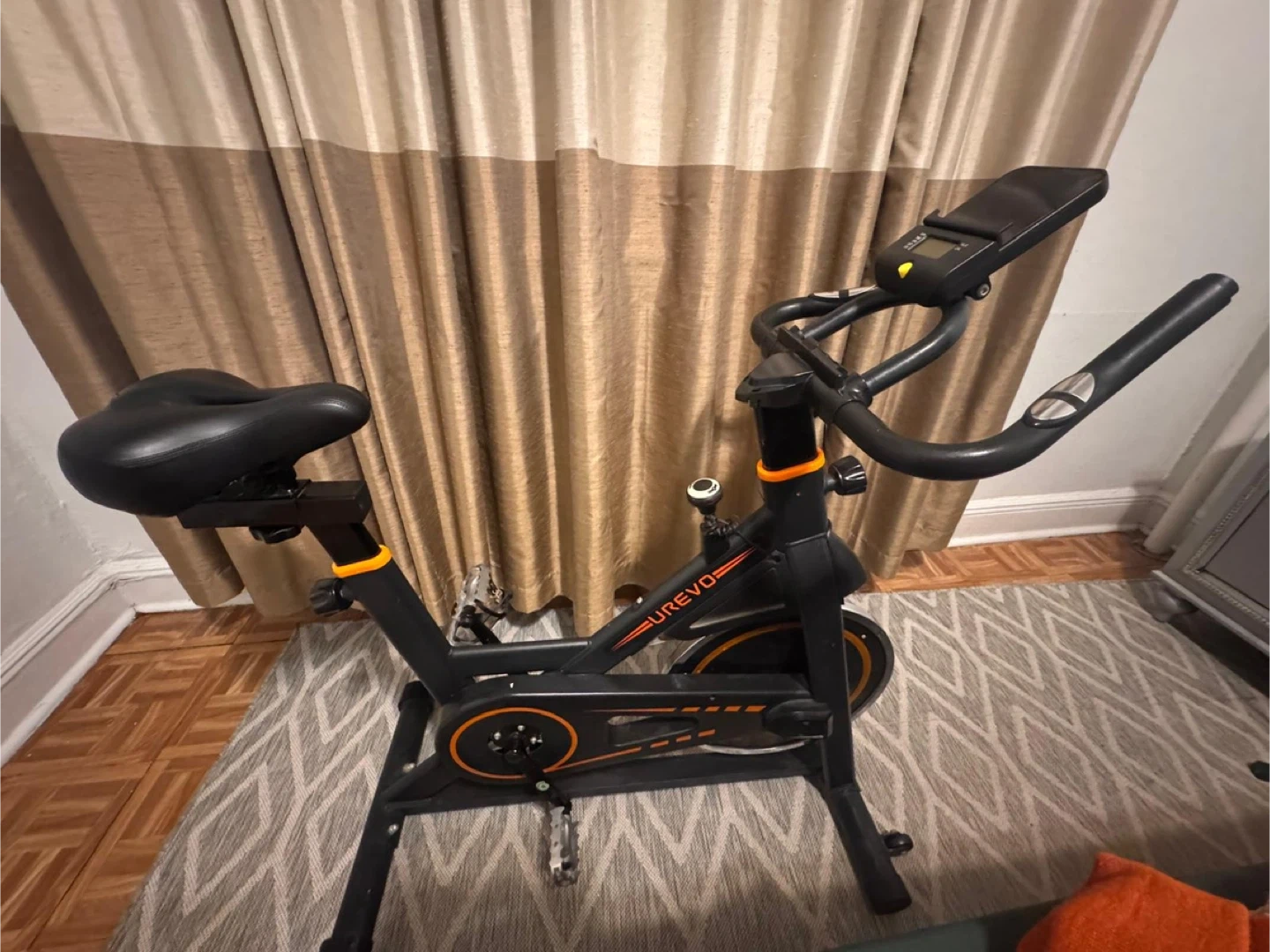 Selling a UREVO exercise bike in good condition. It's perfect for getting a workout in at home. The bike is black with orange accents. Feel free to ask any questions!