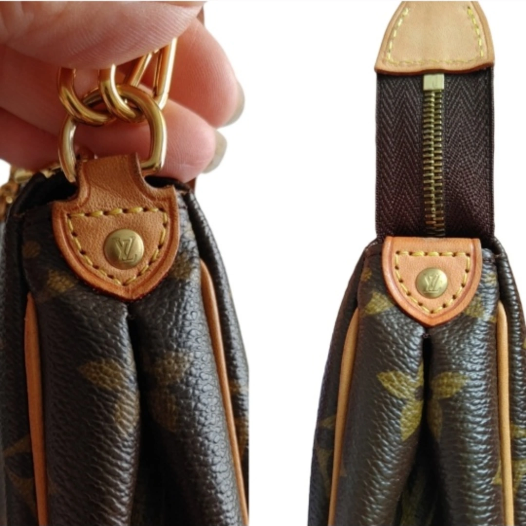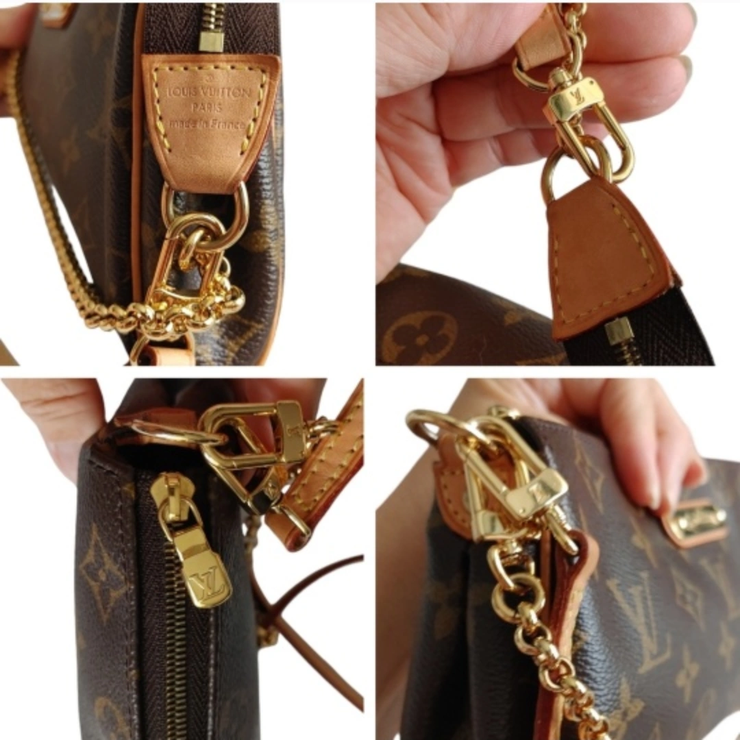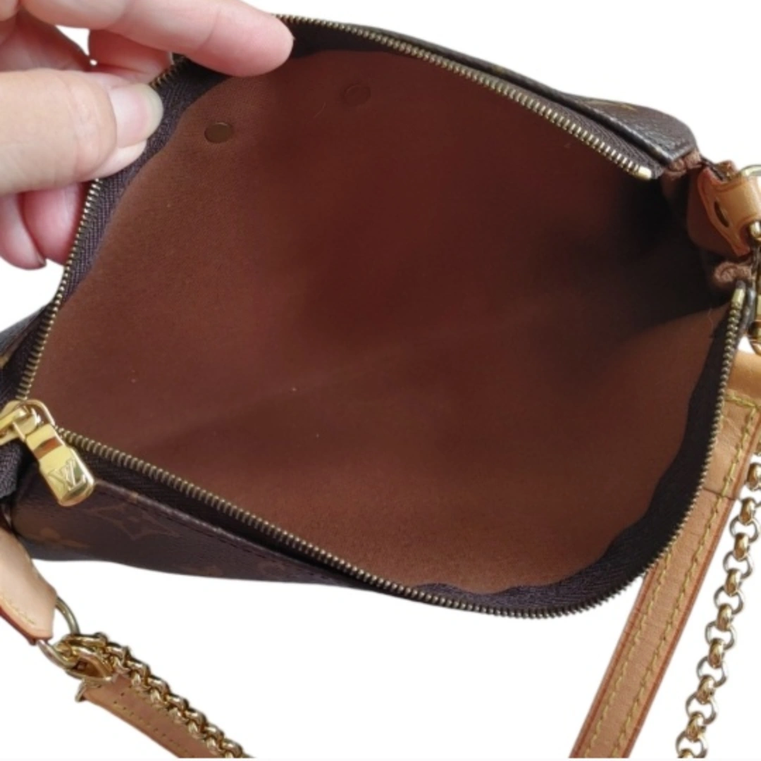 This Louis Vuitton can be carried by hand, as a clutch or Pochette, over the shoulder and crossbody.