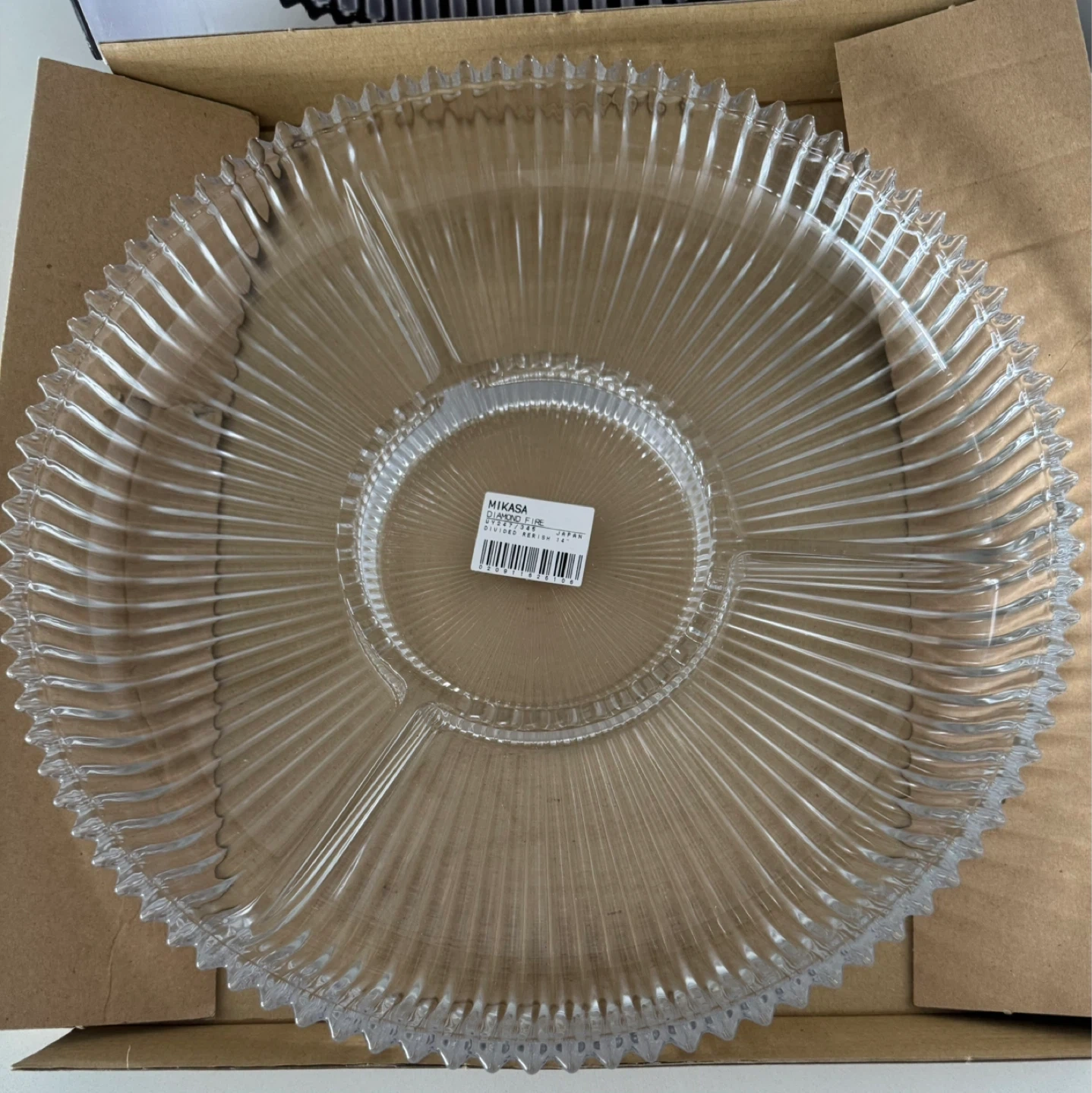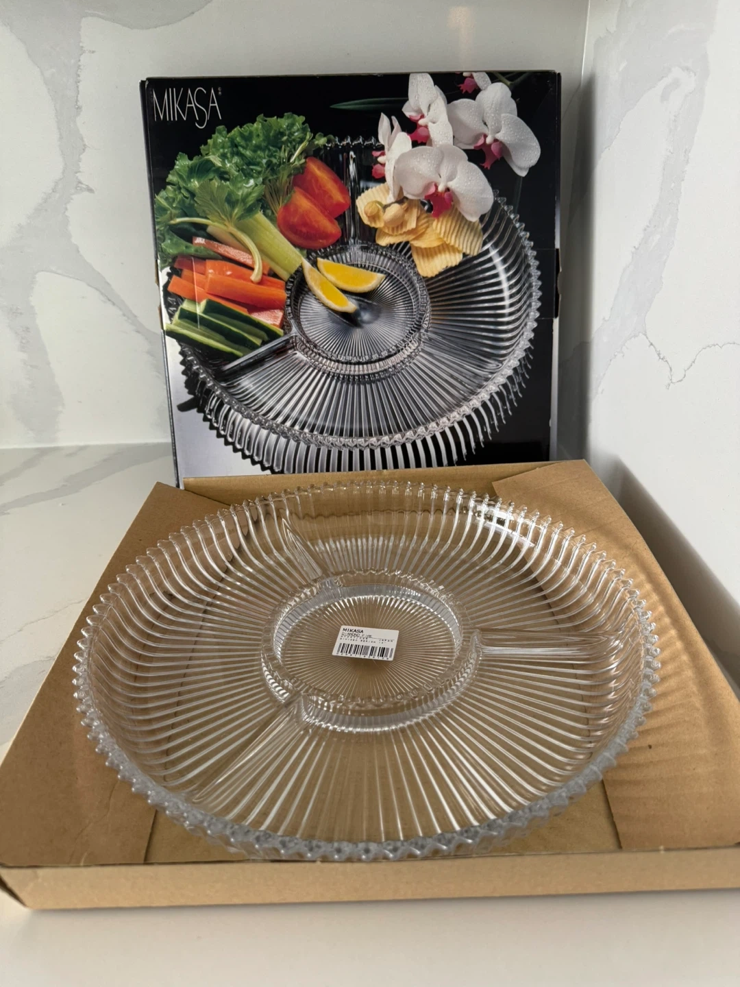 Mikasa Diamond Fire divided relish tray, 14 inches in diameter. Clear glass construction with a fluted design. Includes original box.