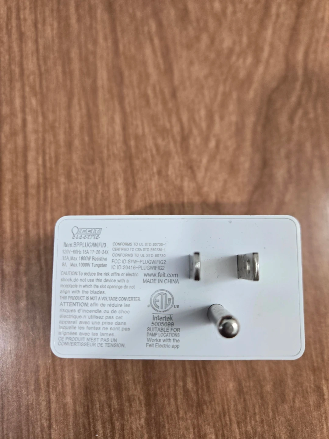 Feit Electric Smart Plug with Wi-Fi connectivity. Works with the Feit Electric app. 15A, Max 1800W Resistive and 15A, Max 1800W Tungsten.