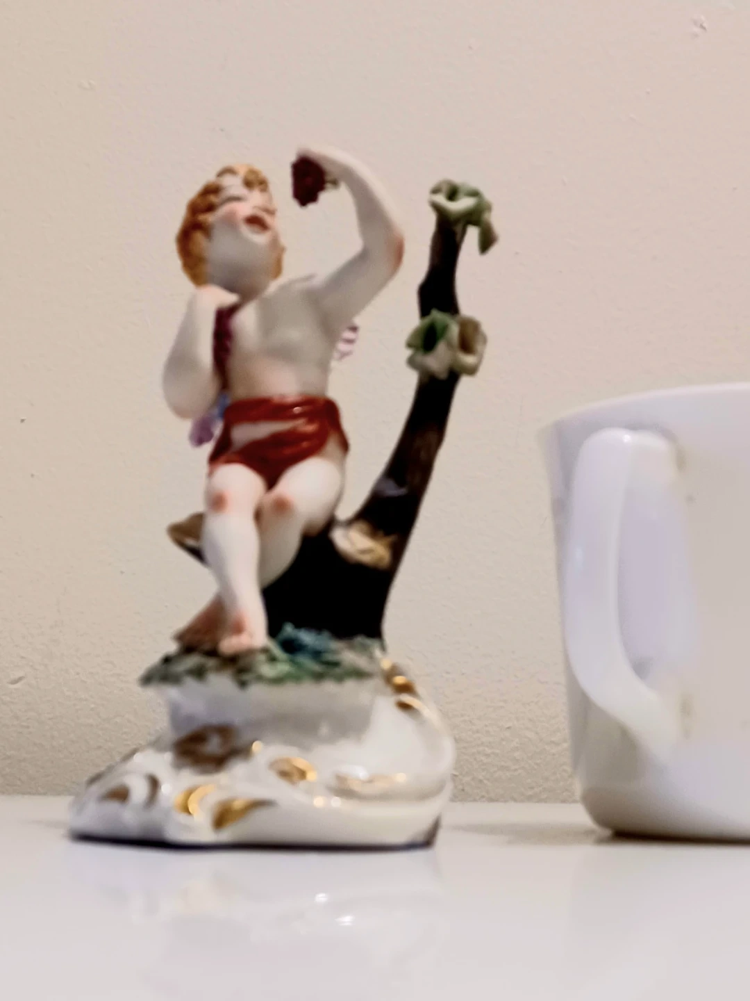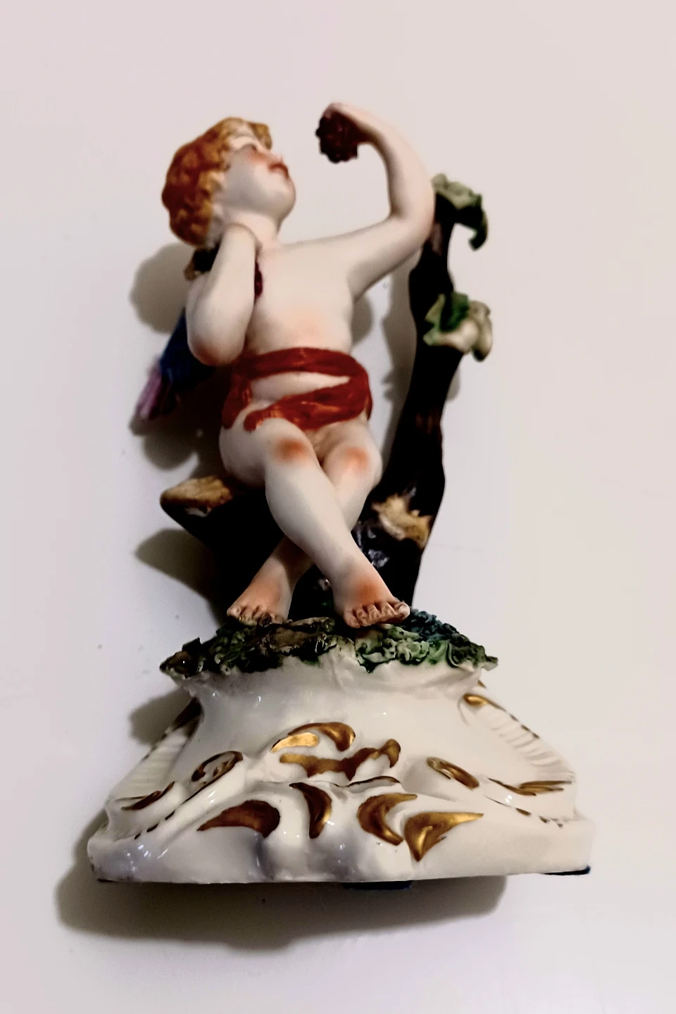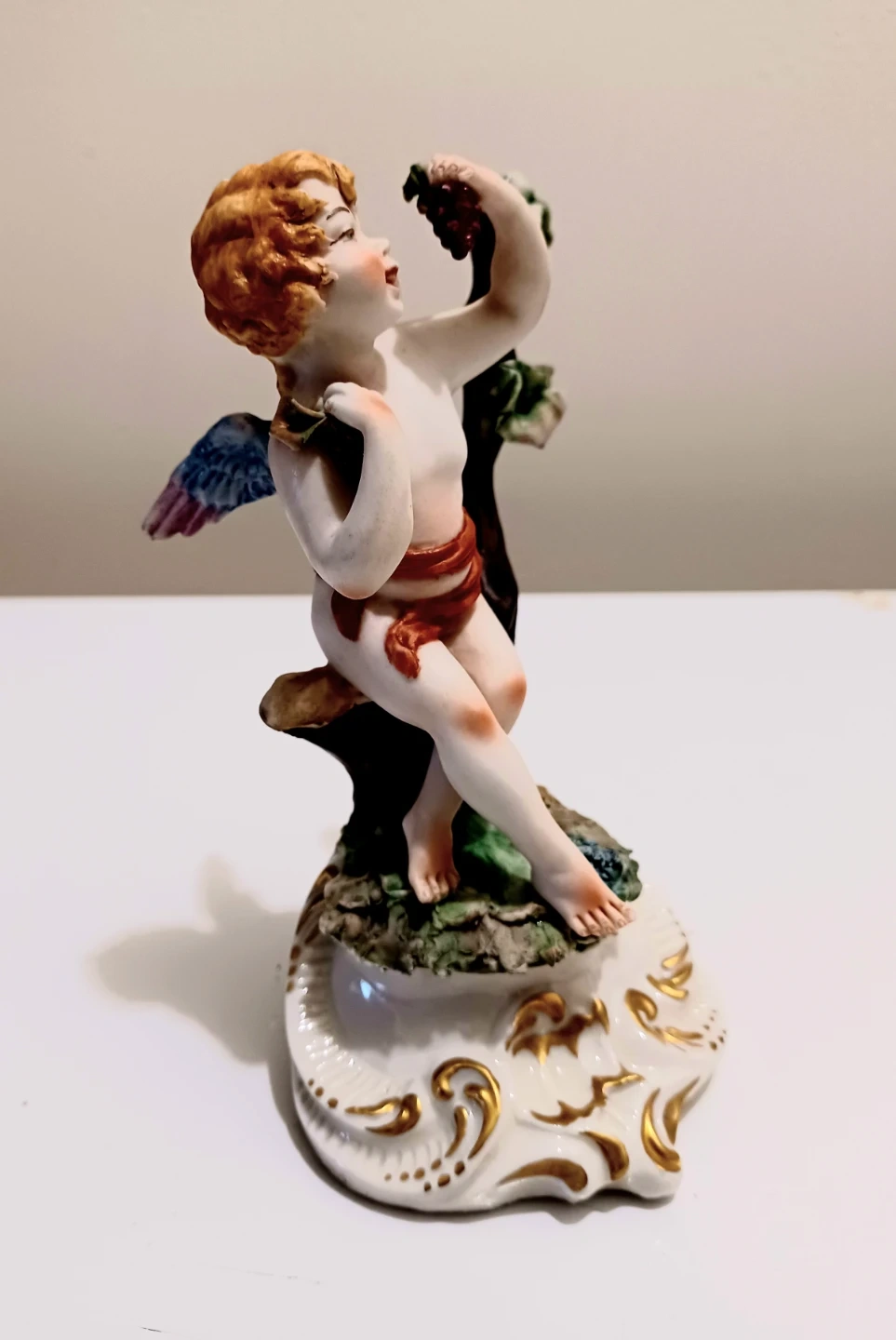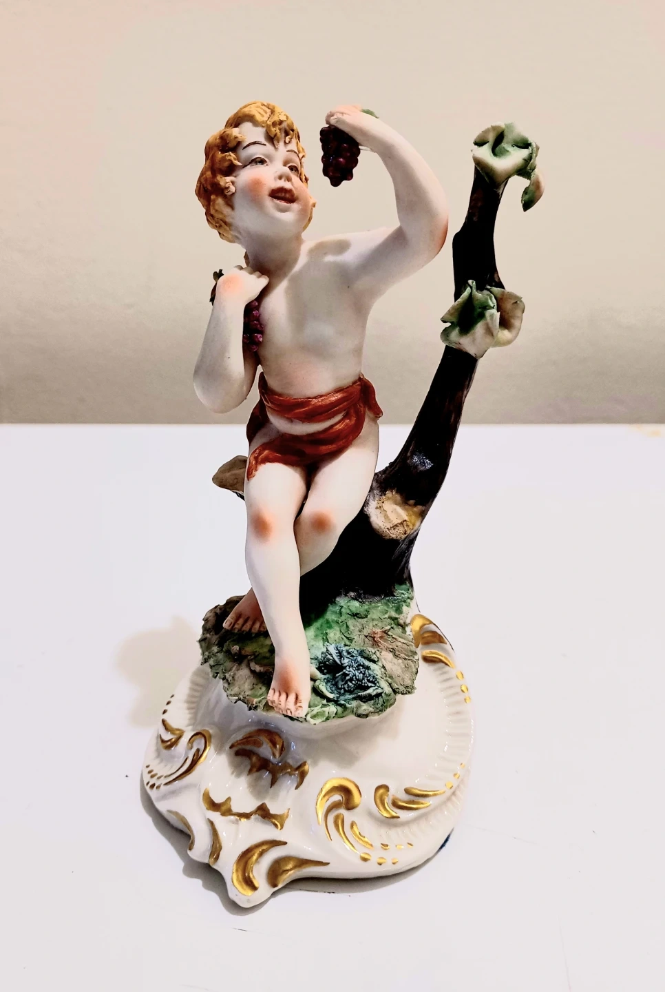 The figurine depicts an angel seated on a tree while eating grapes. This antique item is still in an Excellent condition