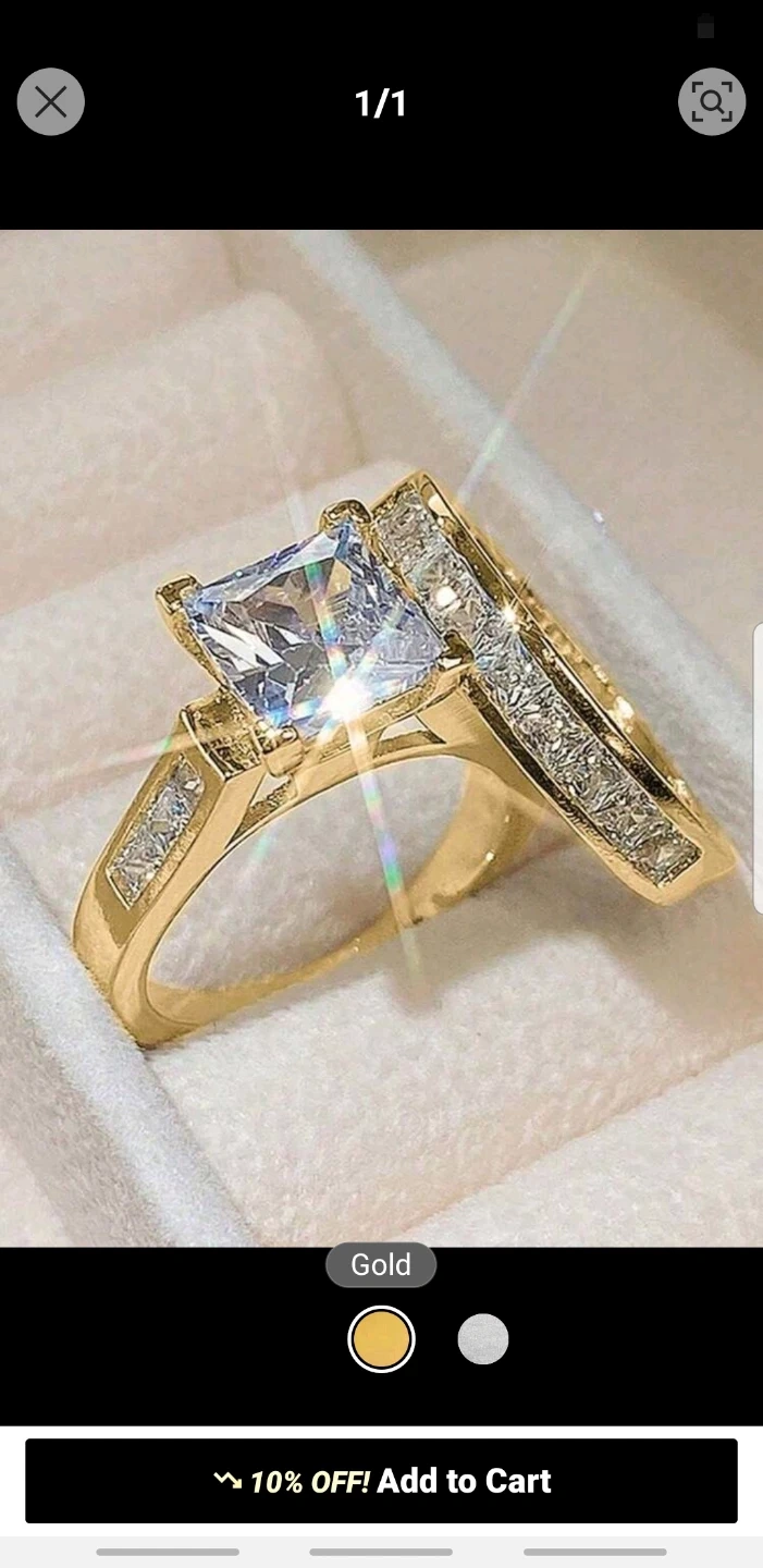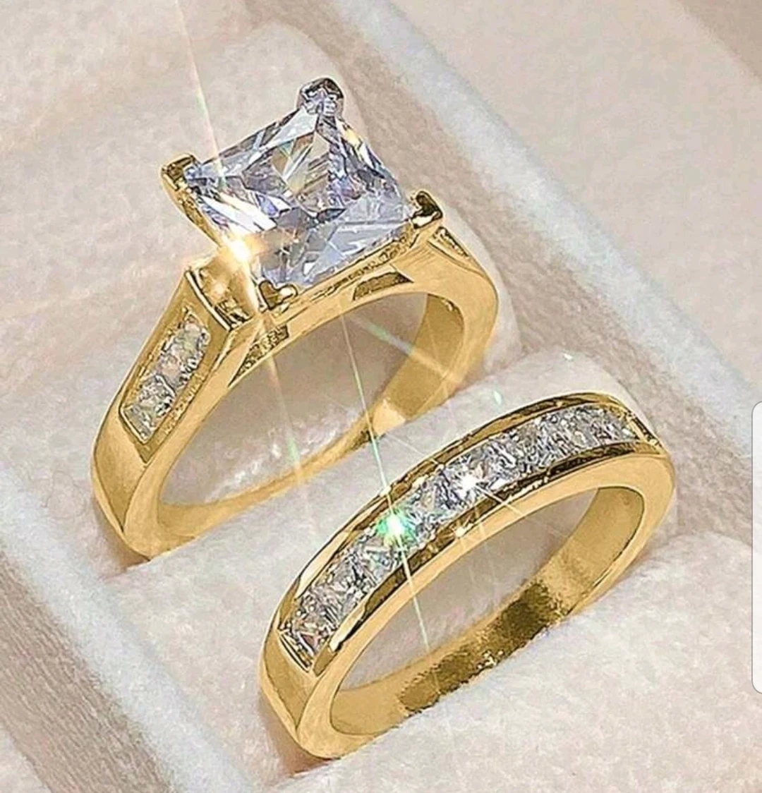 Gorgeous gold-toned ring set featuring a princess cut centre stone and a pave band. This set adds a touch of sparkle to any occasion. It's a beautiful statement piece!