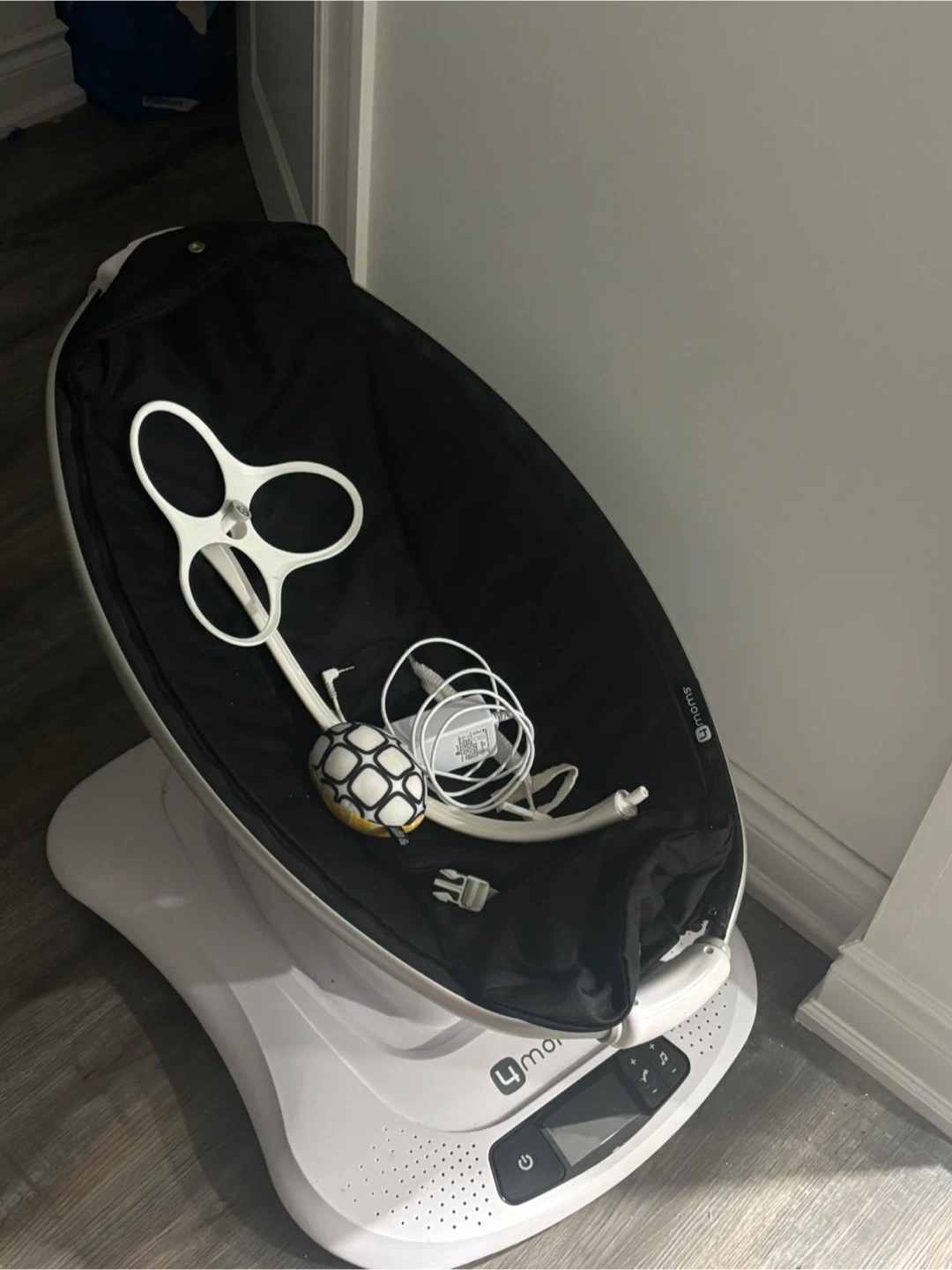 This 4moms MamaRoo baby swing is in black. It includes the mobile and power cord. It's designed for soothing babies with its various motion options. This is a great item for parents looking for a smart way to entertain their little ones.