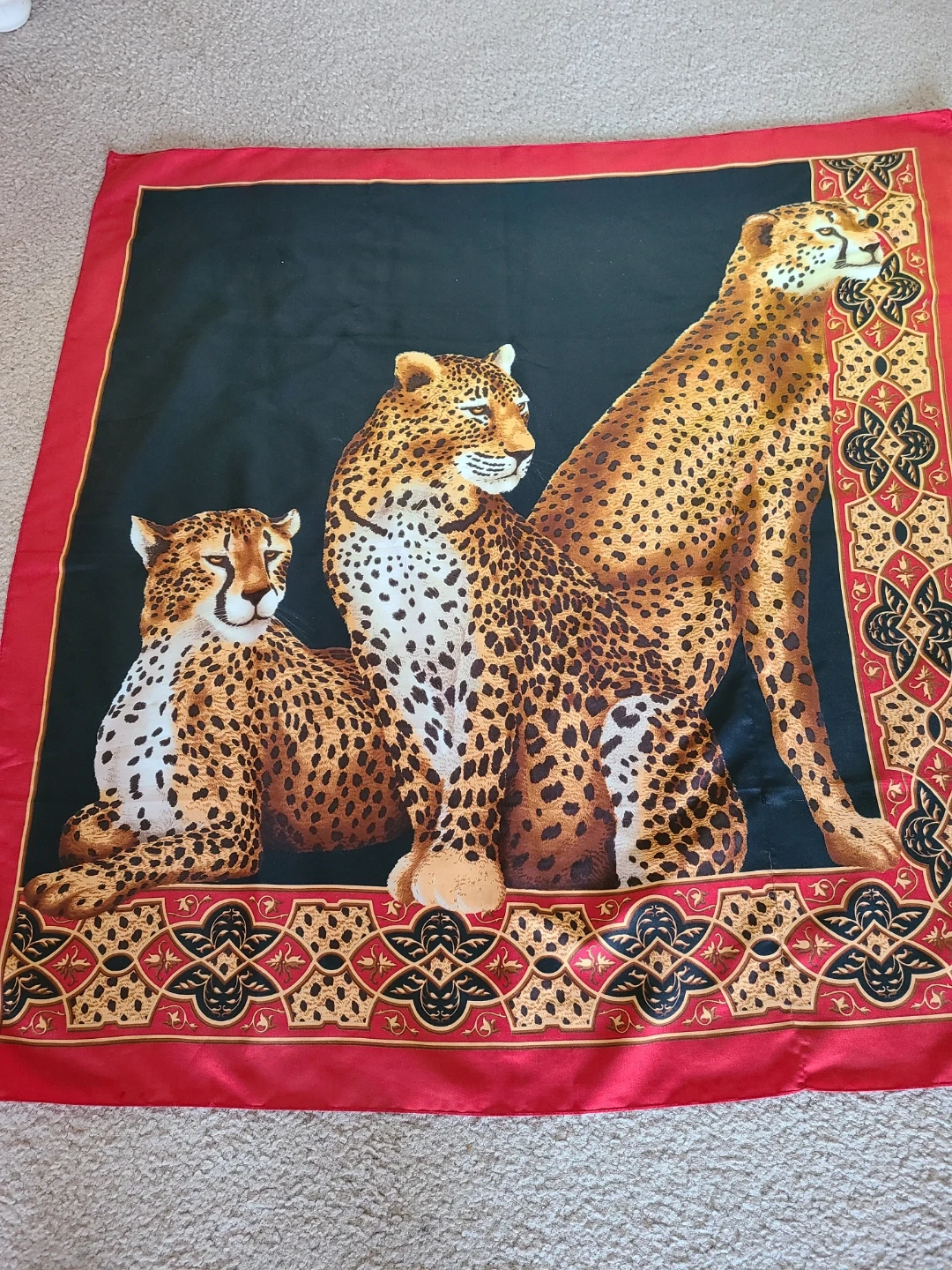This is a large scarf featuring a vibrant cheetah print with a decorative red and gold border. It's made from a smooth, silky material. The generous size makes it versatile for various styling options.