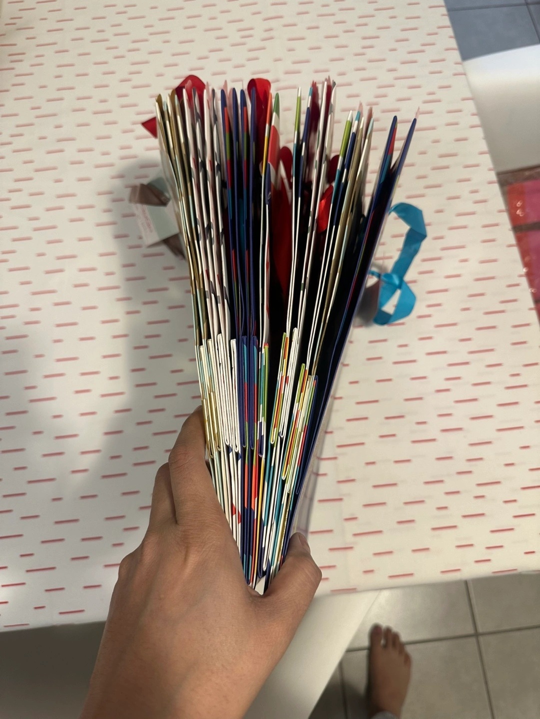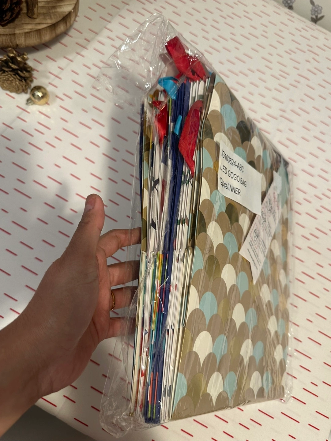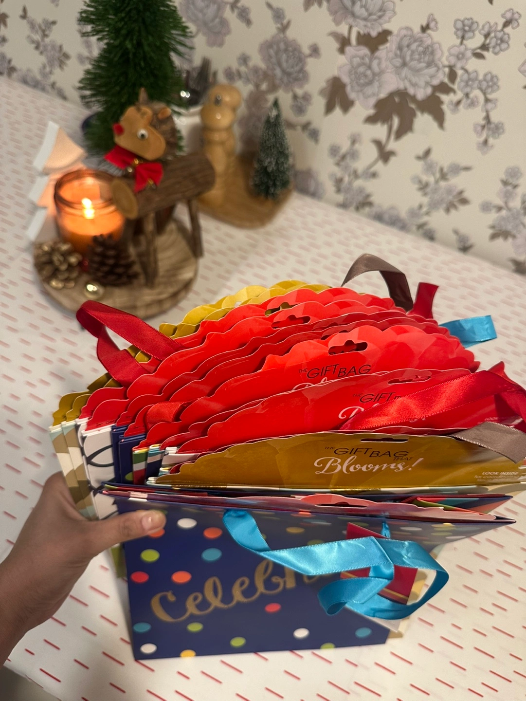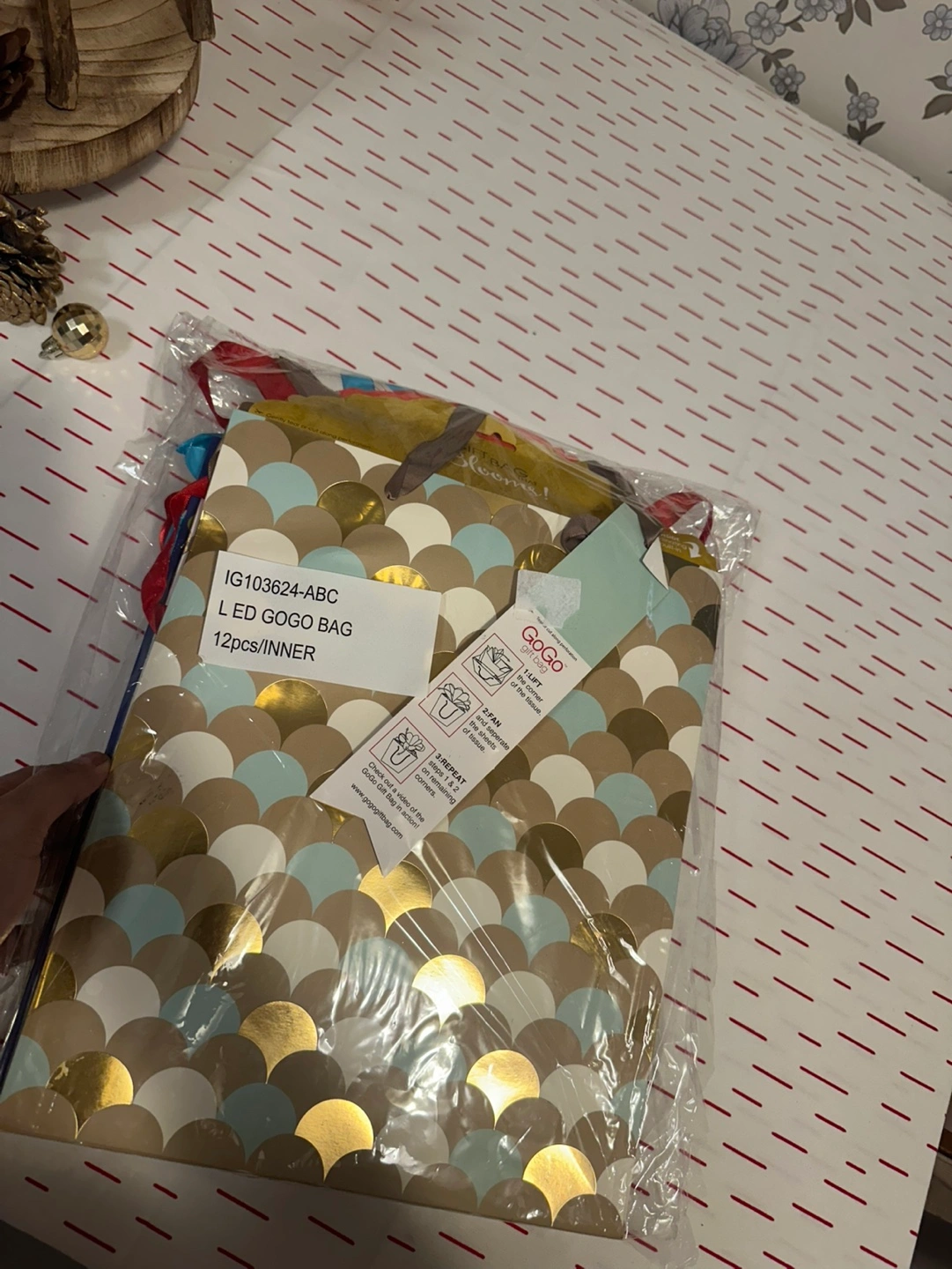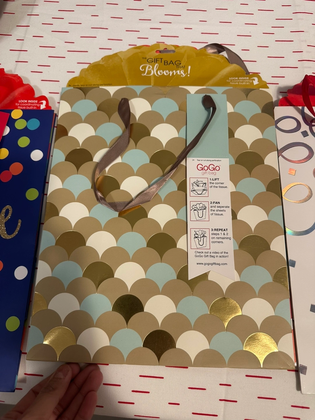 13 pack of gift bags. 4 different designs. Blue with colorful dots and gold with a blue and gold scale pattern.
