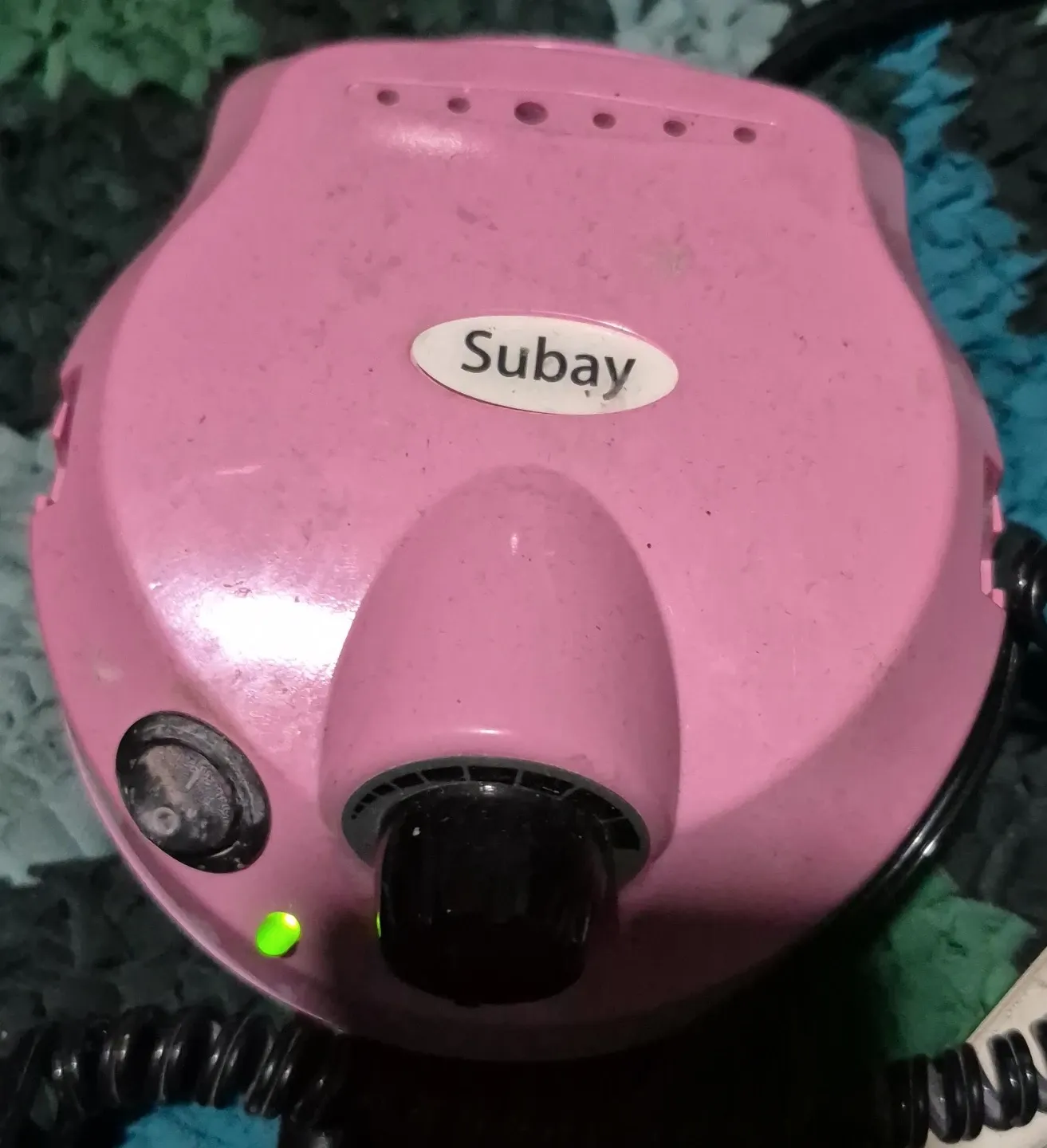 This is a pink electric nail drill by Subay. It features an adjustable speed dial and a power switch. The unit has a green indicator light when powered on.