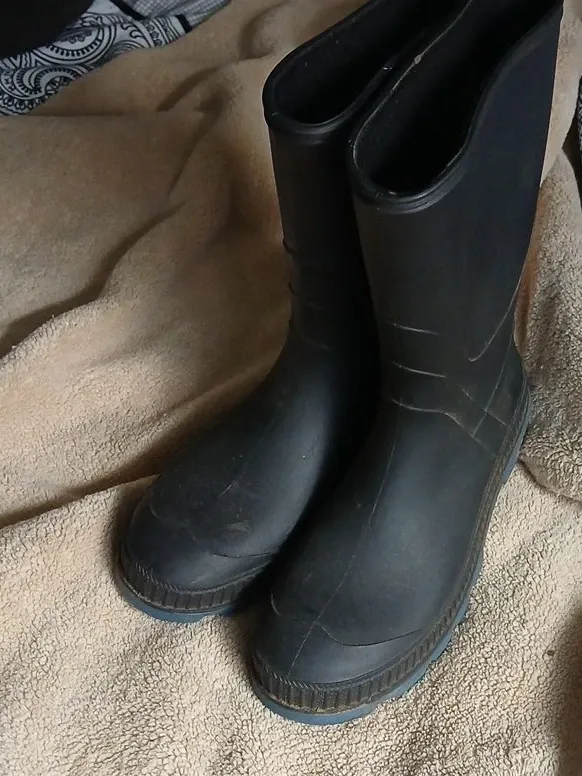 Pair of black rubber work boots. They're waterproof and have a good grip on the soles. These boots are great for muddy conditions or general outdoor work.