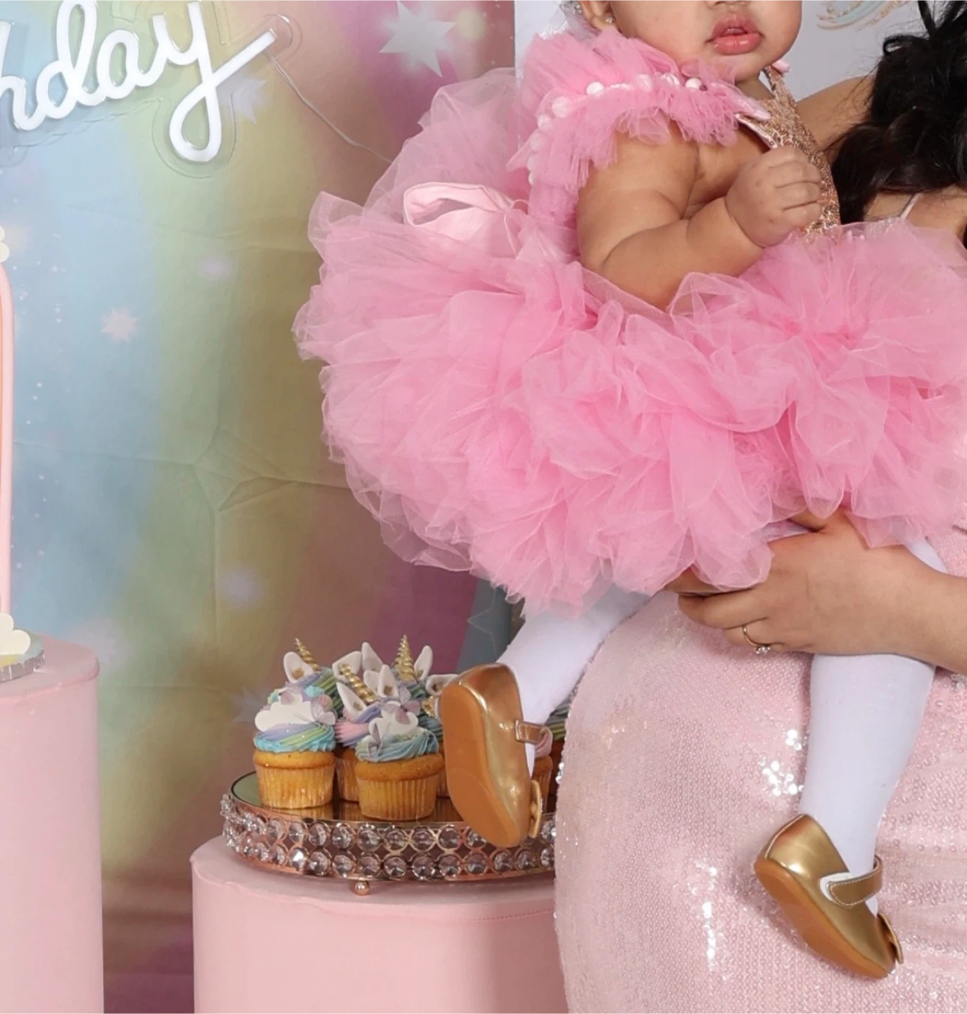 Adorable pink tulle tutu dress with a gold sequin bodice. It features a delicate pearl and floral crow , perfect for a special occasion like a birthday party or photoshoot. Includes matching gold ballet shoes. Size 2T.