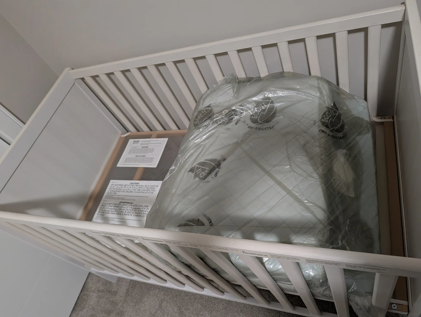 White baby crib from IKEA. Comes with mattress in original packaging. Instructions included. Crib has a white finish.