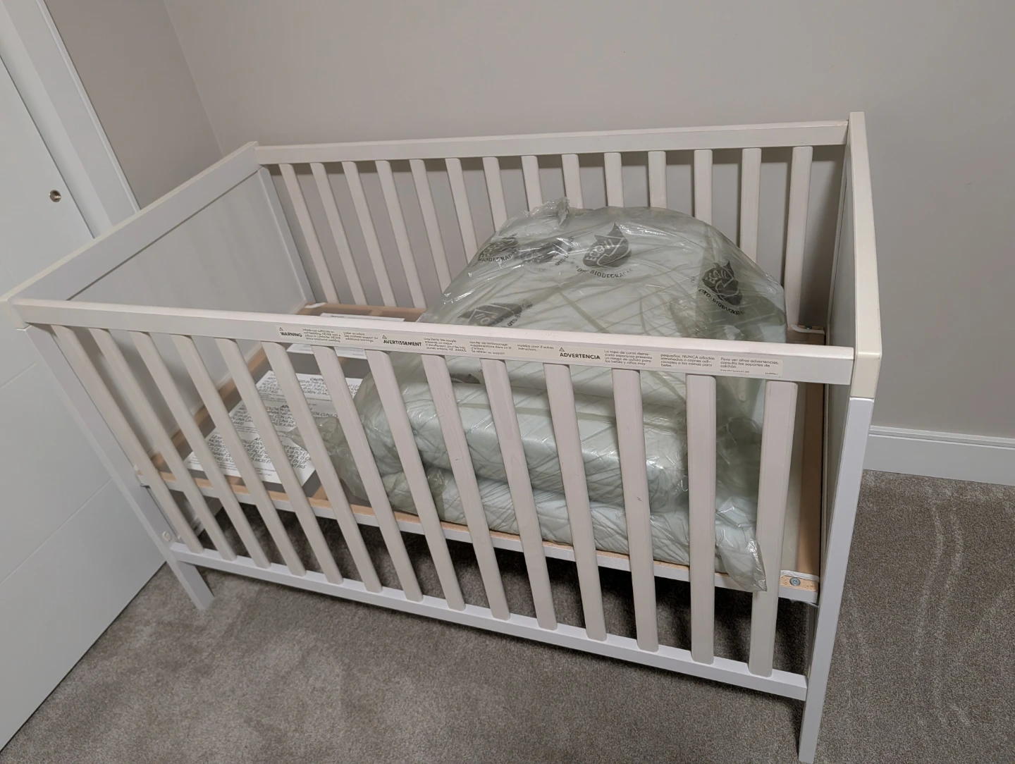 White baby crib from IKEA. Comes with mattress in original packaging. Instructions included. Crib has a white finish.