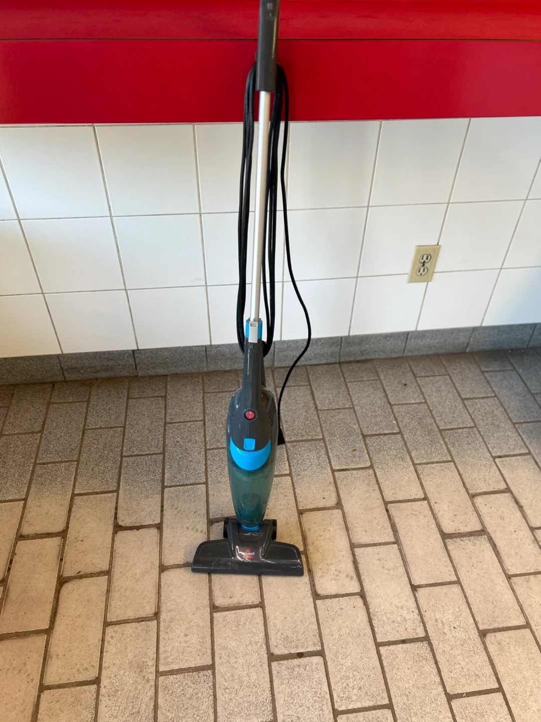 This is a Bissell stick vacuum. It's lightweight and easy to manoeuvre. Great for quick cleanups around the house!