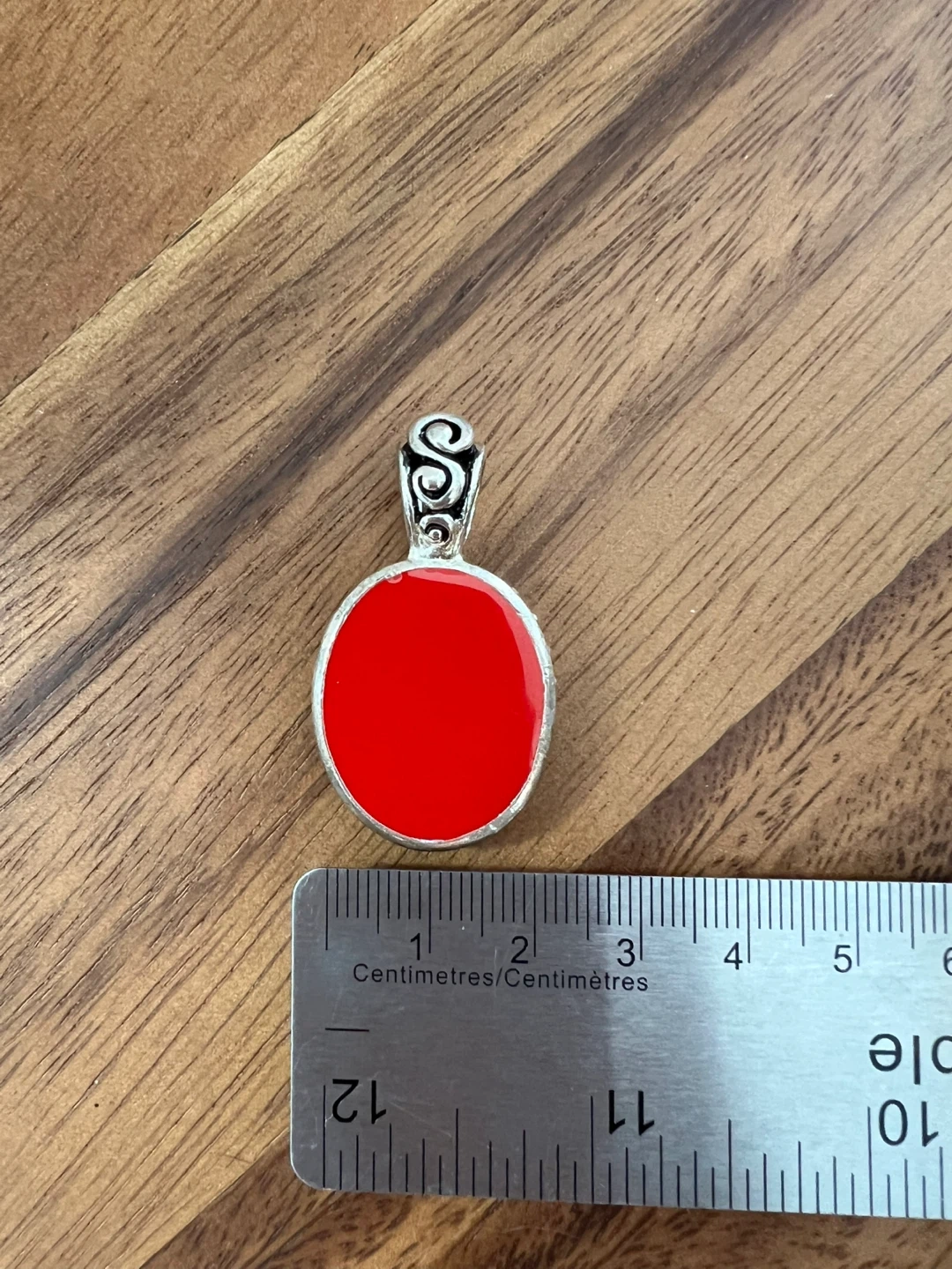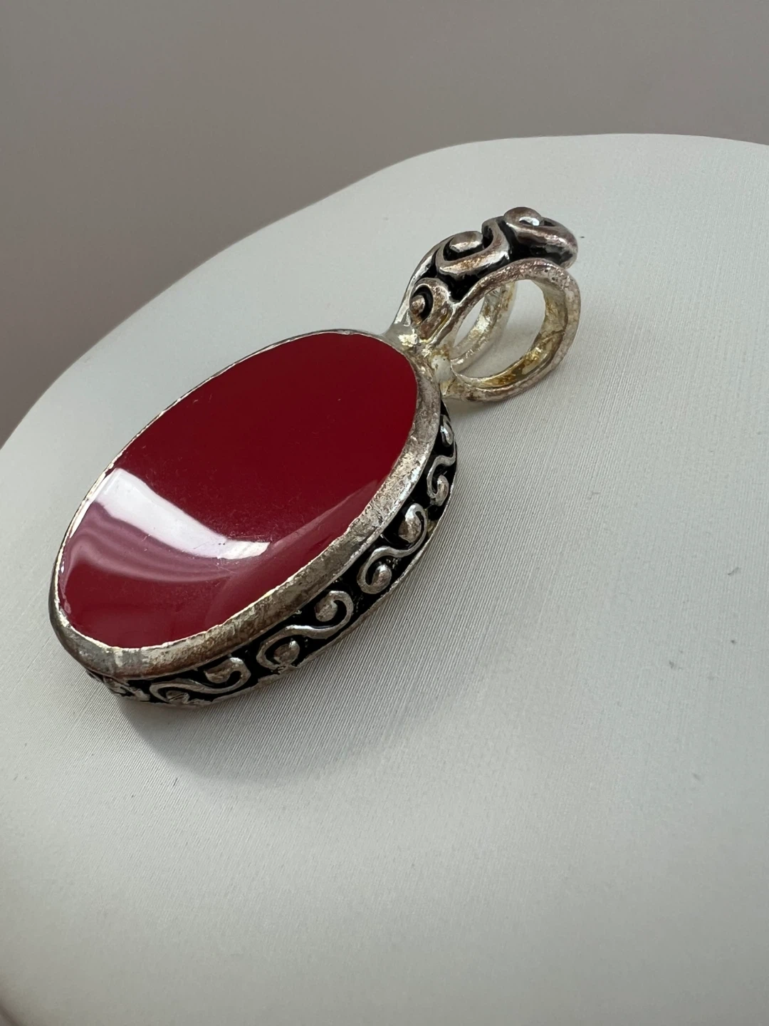 Here's a lovely pendant featuring a red stone. The pendant has a silver coloured metal with a decorative design around the stone. The stone is smooth and oval-shaped. It would be a nice addition to any jewelry collection. It measures approximately 4cm long.