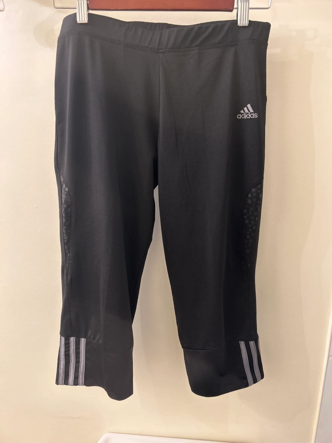 Black Adidas running capris. Features subtle star pattern on the sides. Good condition. Size m-L