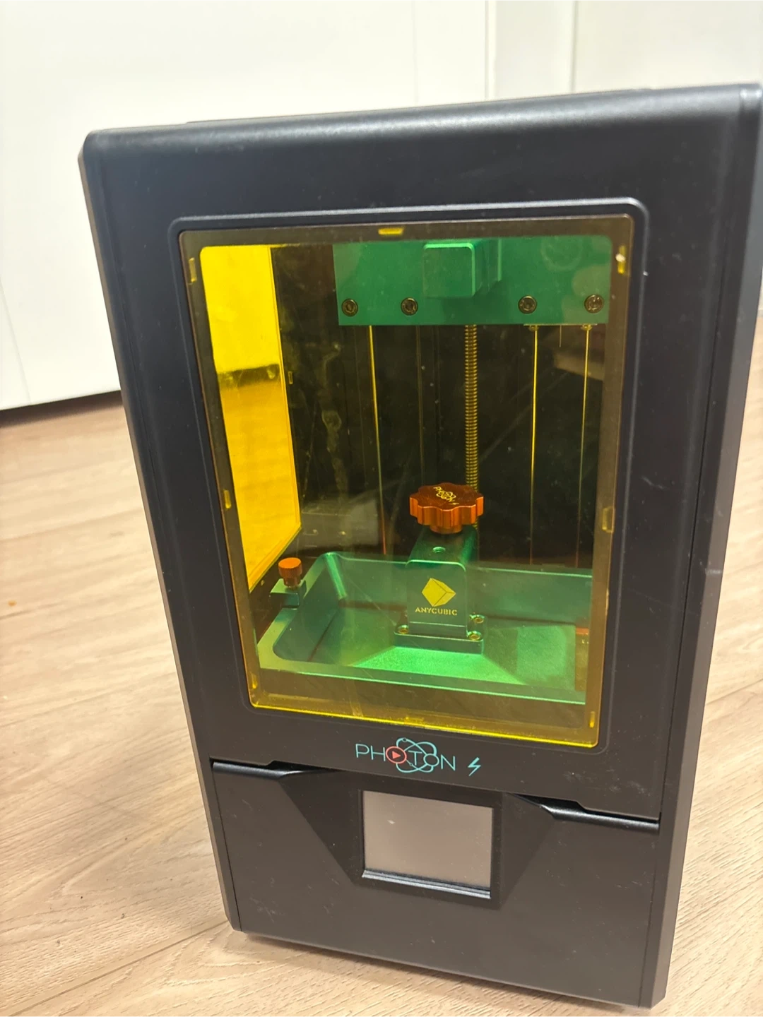 This is an Anycubic Photon S resin 3D printer. It's black with a yellow UV cover. It has a touchscreen display for controls.