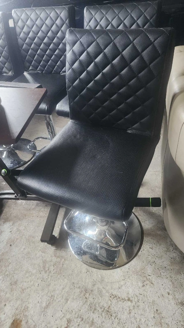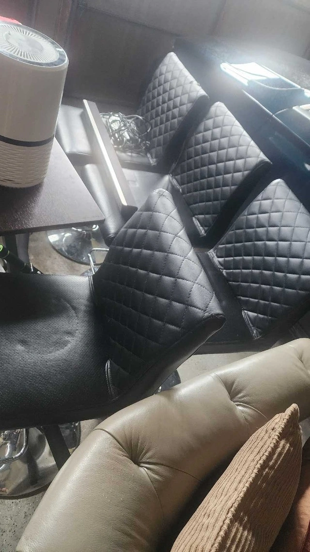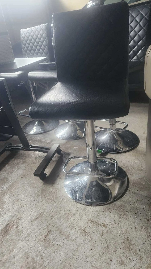 I am selling a set of used black bar stools with a stylish diamond-patterned back, perfect for adding a modern touch to your kitchen or bar area. These stools feature a comfortable seat and a sturdy base, making them both functional and chic. They have some signs of wear, which I've tried to capture in the photos, but are overall in good condition. Here are some details: