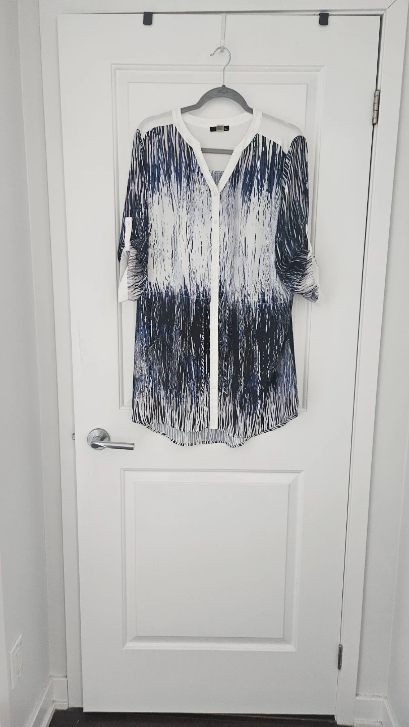 This Renuar shirt dress features a black, white, and blue abstract print. It's a size large (BUT fits a medium perfectly as well) with roll-up sleeves and a button-up front. Perfect for spring and summer! Lovely color.