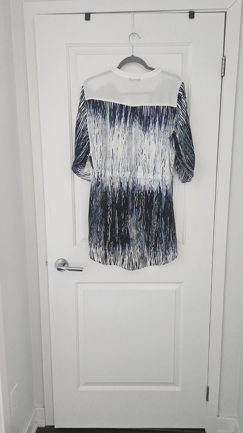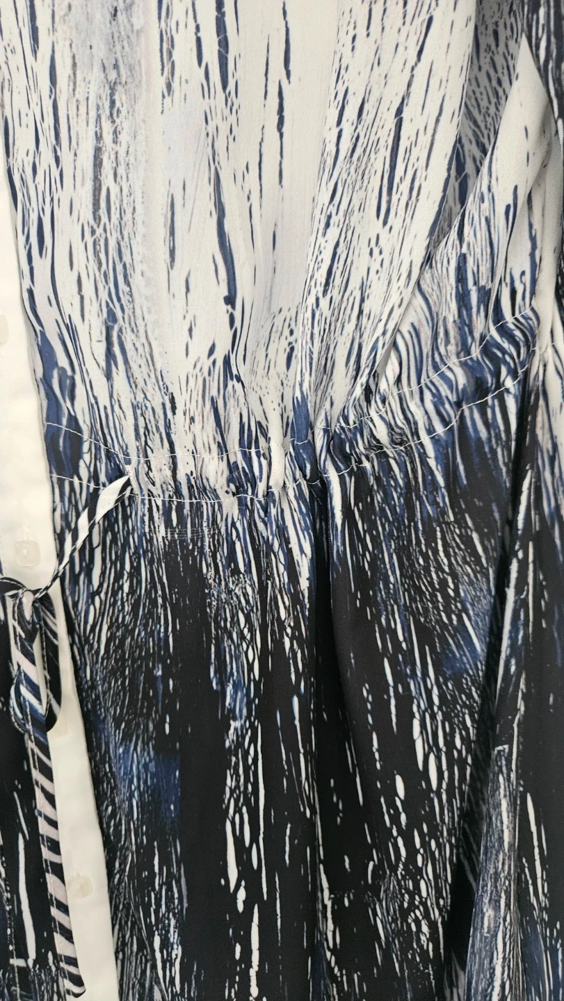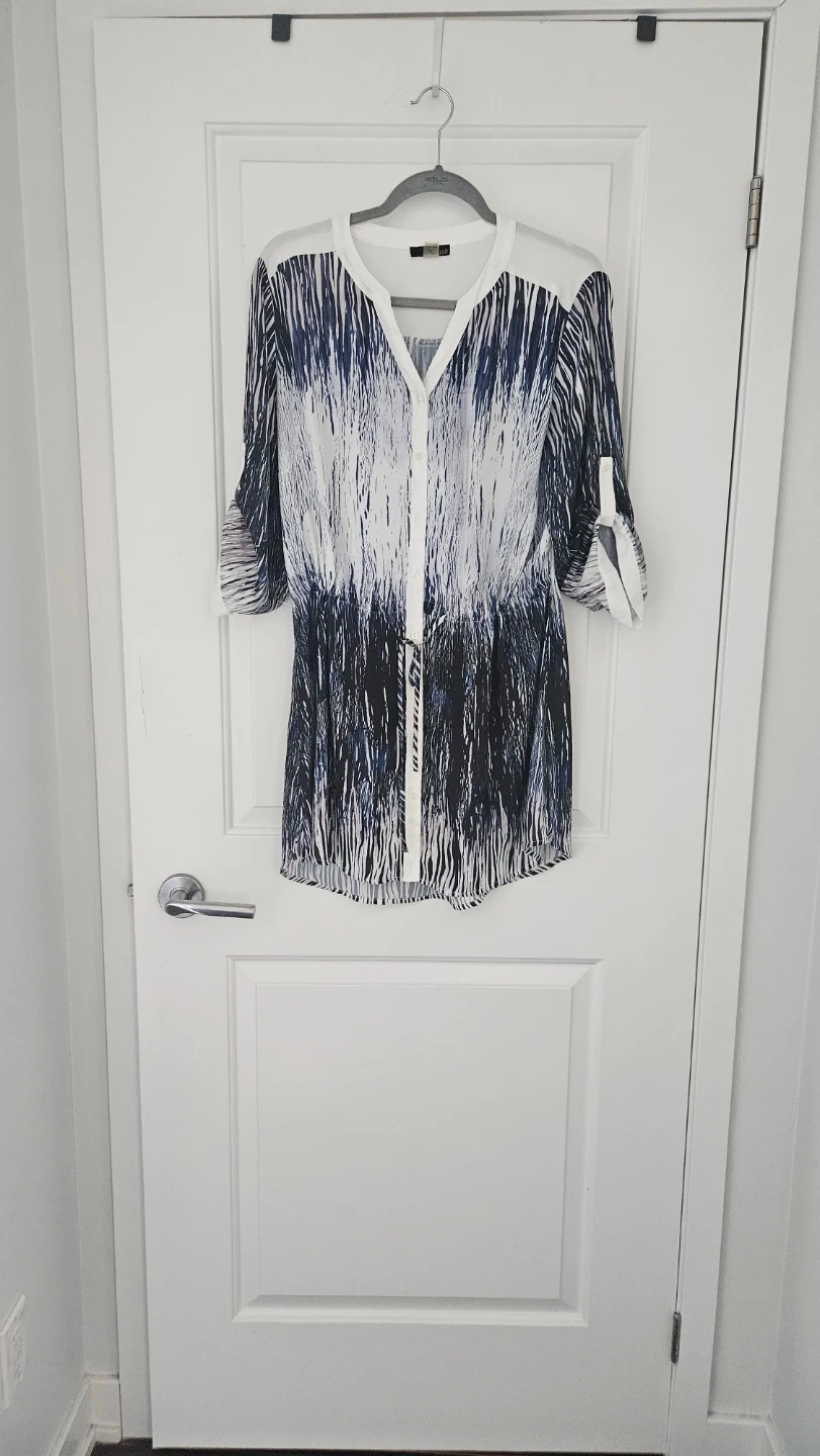 This Renuar shirt dress features a black, white, and blue abstract print. It's a size large (BUT fits a medium perfectly as well) with roll-up sleeves and a button-up front. Perfect for spring and summer! Lovely color.