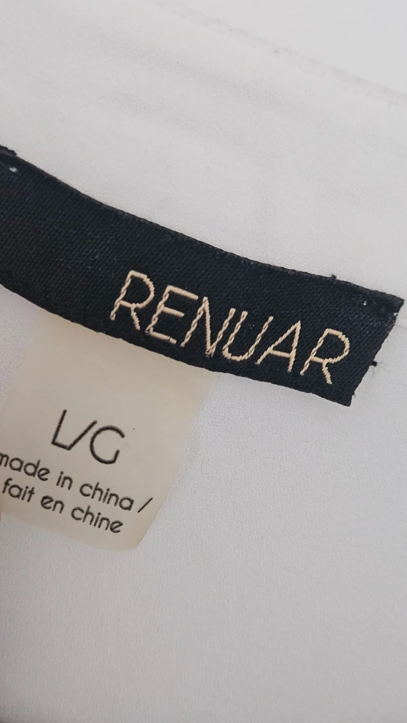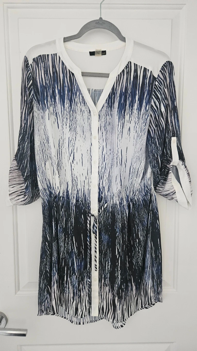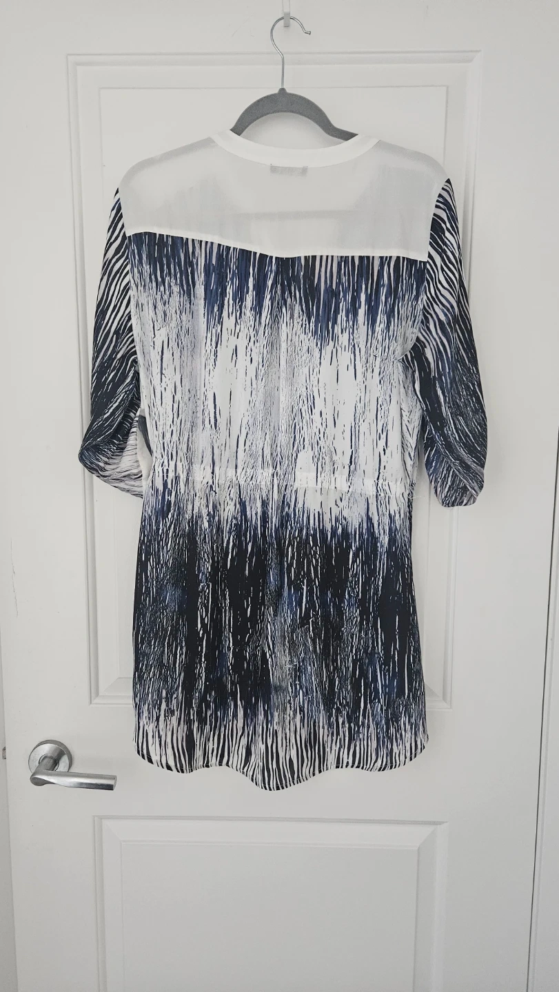 This Renuar shirt dress features a black, white, and blue abstract print. It's a size large (BUT fits a medium perfectly as well) with roll-up sleeves and a button-up front. Perfect for spring and summer! Lovely color.