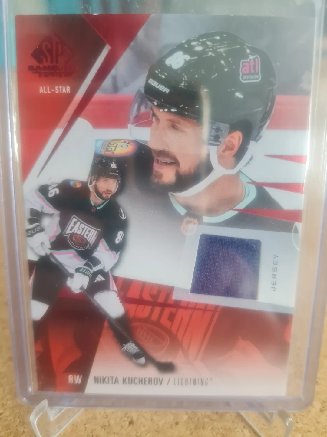 This is an SP All-Star hockey card featuring Nikita Kucherov of the Lightning. It includes a swatch of his jersey. A great addition for any hockey collector!