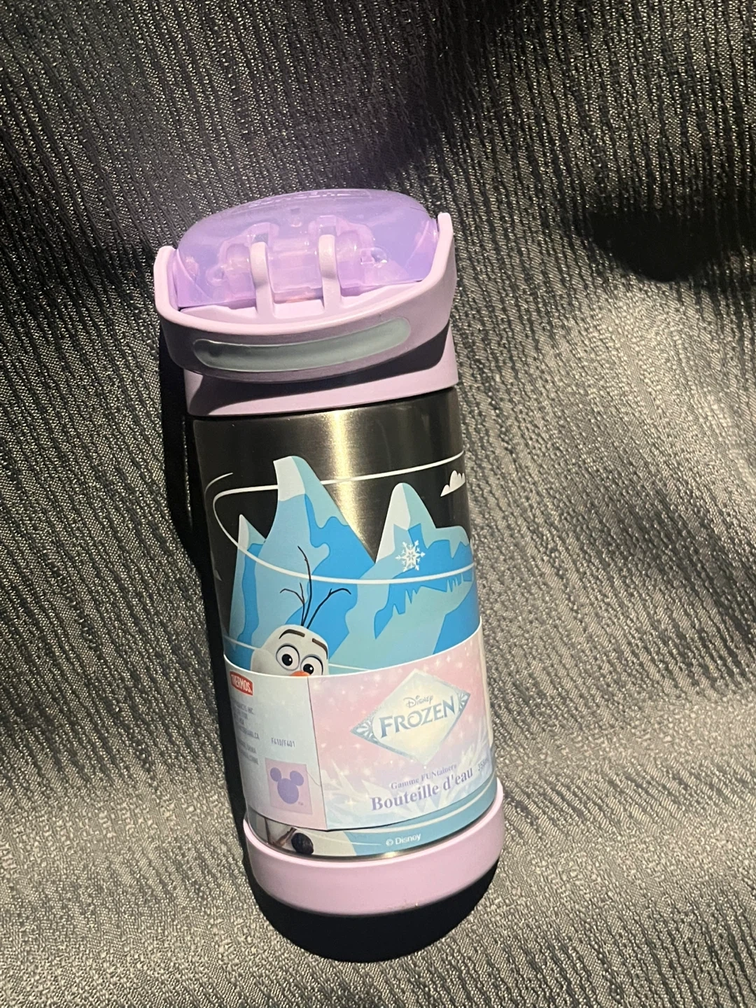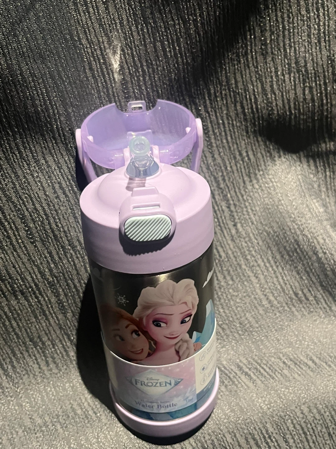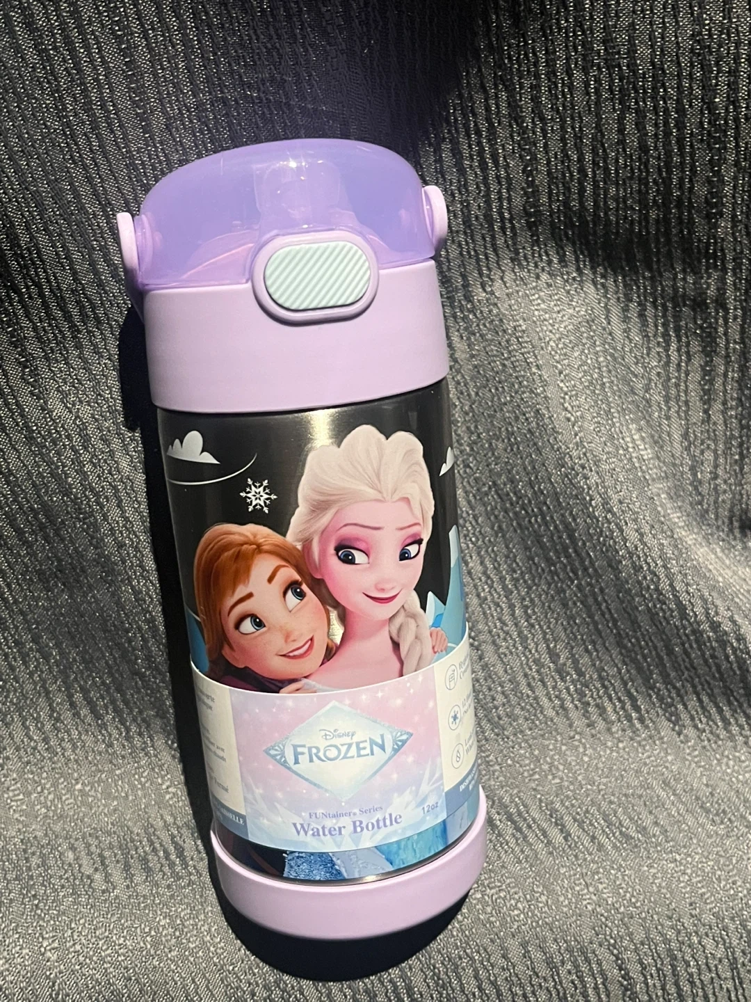 This is a 12oz water bottle featuring characters from Disney's Frozen. It has a purple flip-top lid for easy drinking. Perfect for little ones who love Frozen!