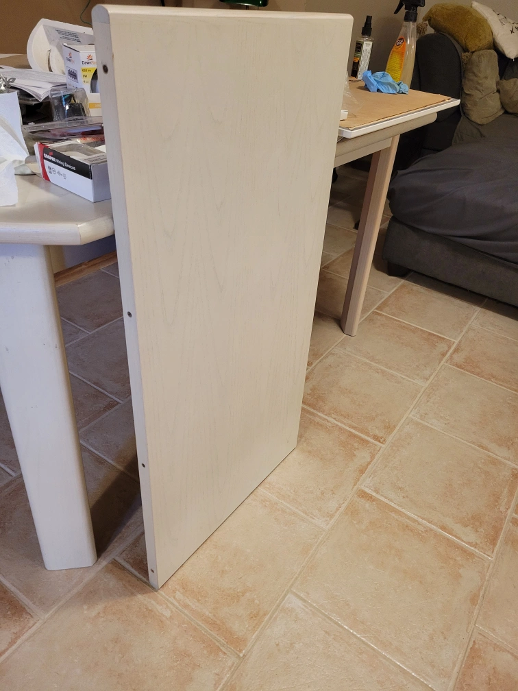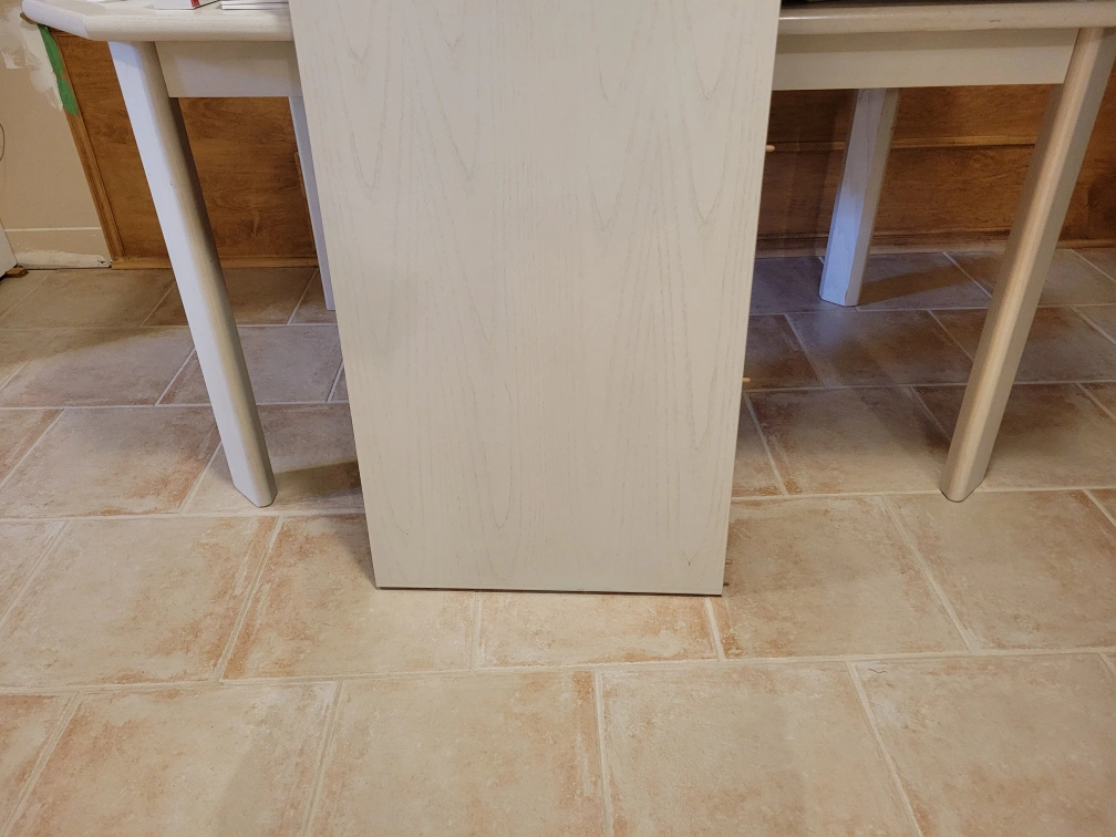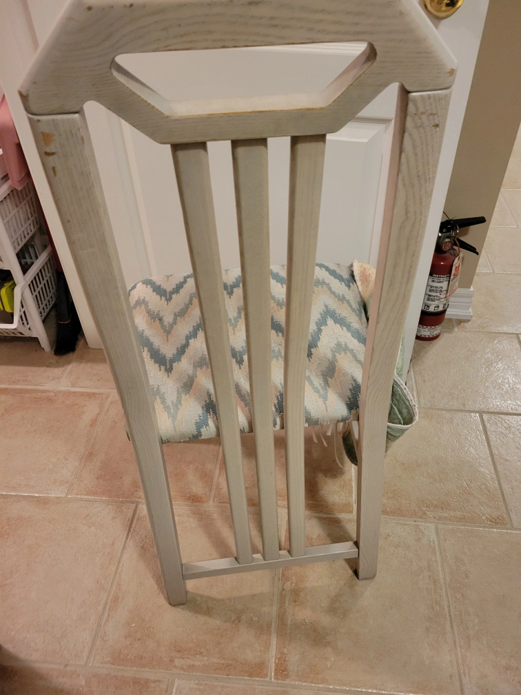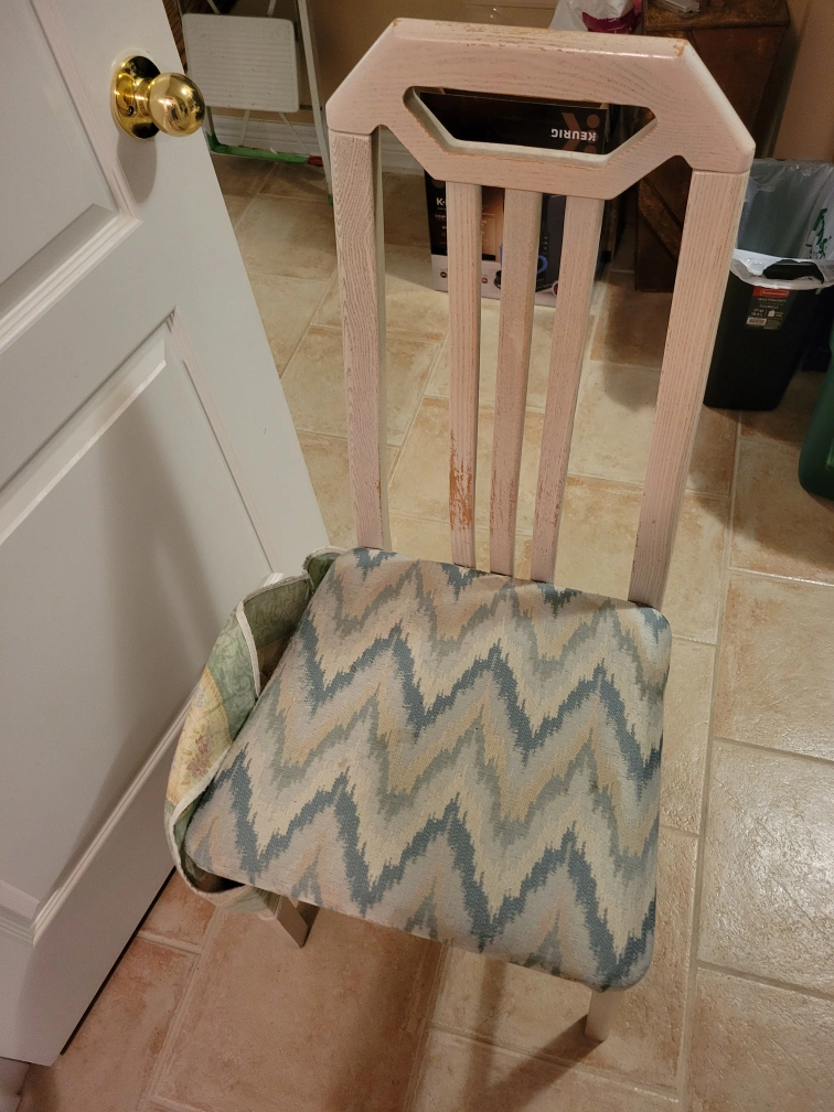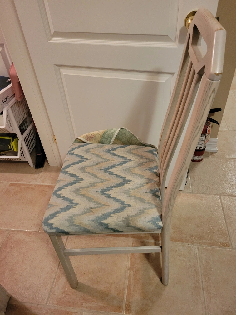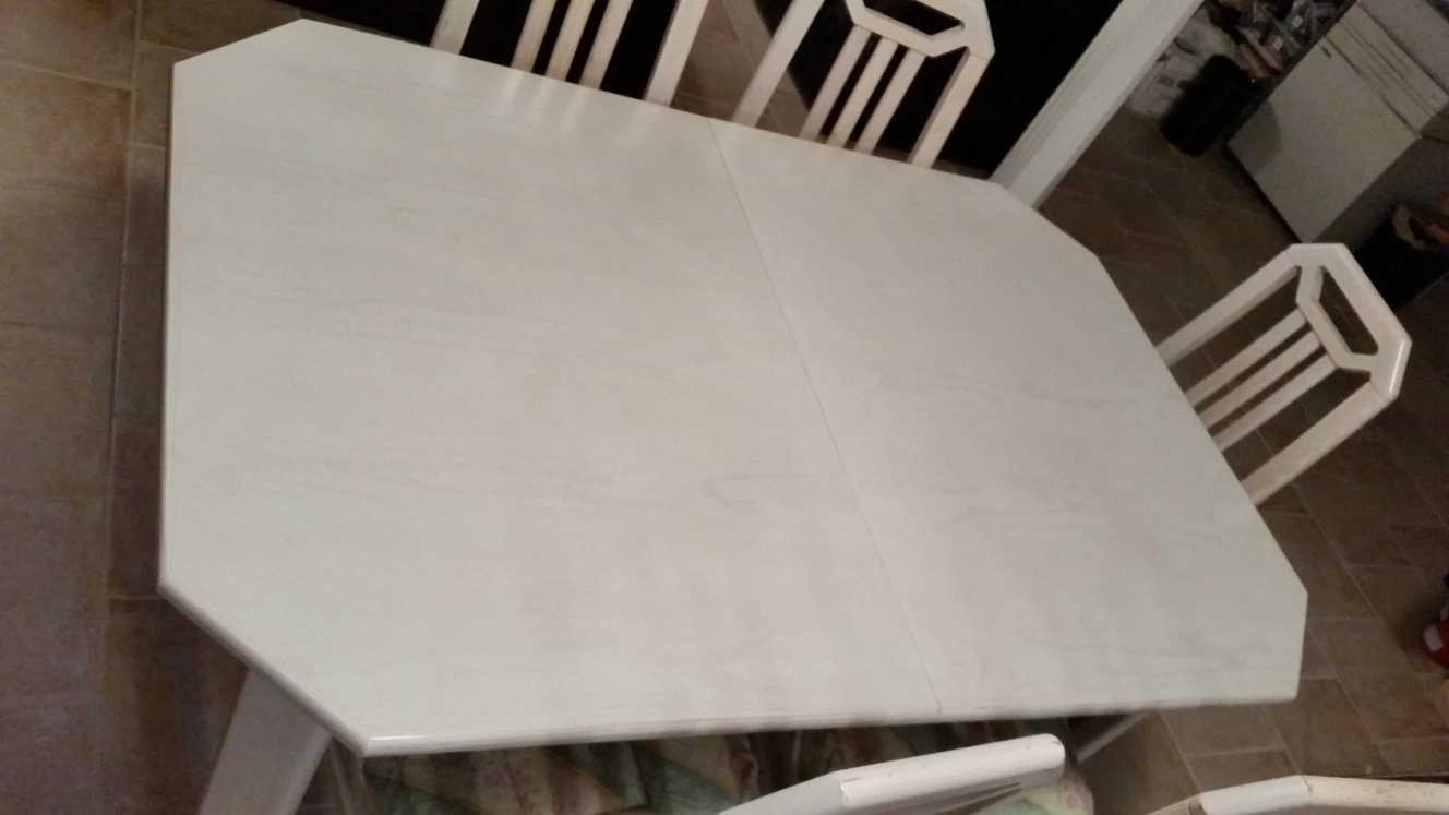 Solid wood table with center extension and 6 solid wood chairs. Modern look that will last with time. Opal color stain. The table is well maintained, and chairs need new cushion covers. Open to offers. As is.