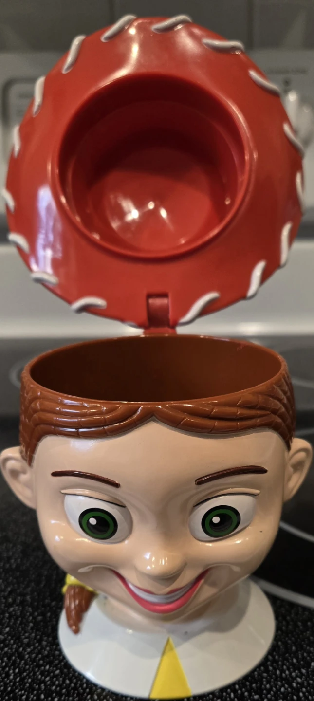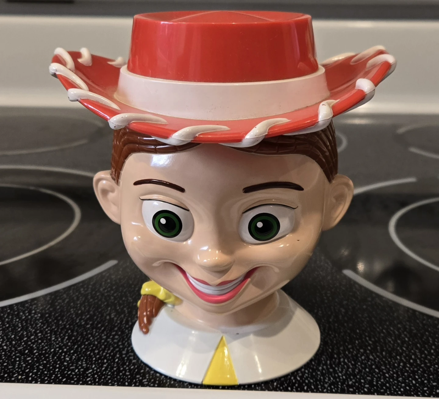 This is a Jessie character cup from Toy Story. It's made of plastic with a red cowboy hat lid. Perfect for a young fan! It is microwave and dishwasher safe. Never been used.