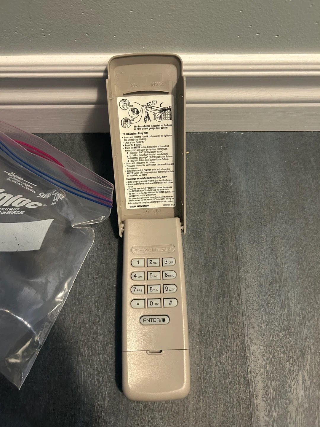 Selling a entry pad for your garage door! The model number is 940EV/940EVC. It comes with a battery and mounting screws. The instructions on how to set a keyless entry PIN are printed on the inside of the cover.