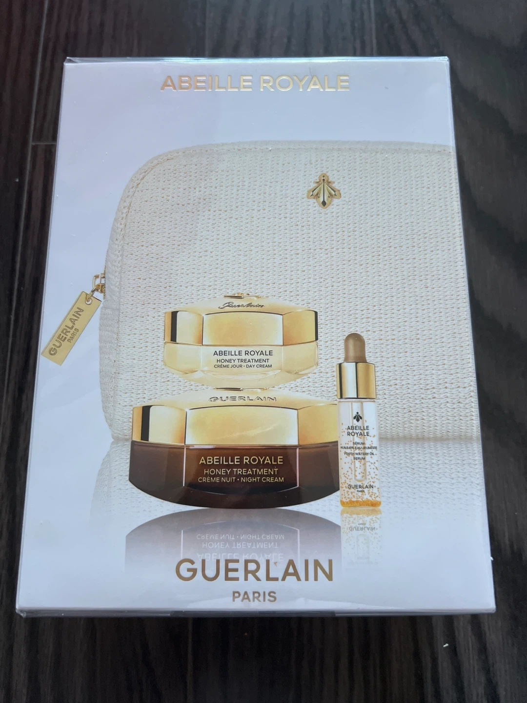 Selling a Guerlain Abeille Royale Honey Treatment set! This set includes the night cream (50ml/1.6 fl oz) and the day cream (15ml/0.5 fl oz), along with the Youth Watery Oil (5ml). It's a great skincare set to keep your skin looking radiant and smooth.