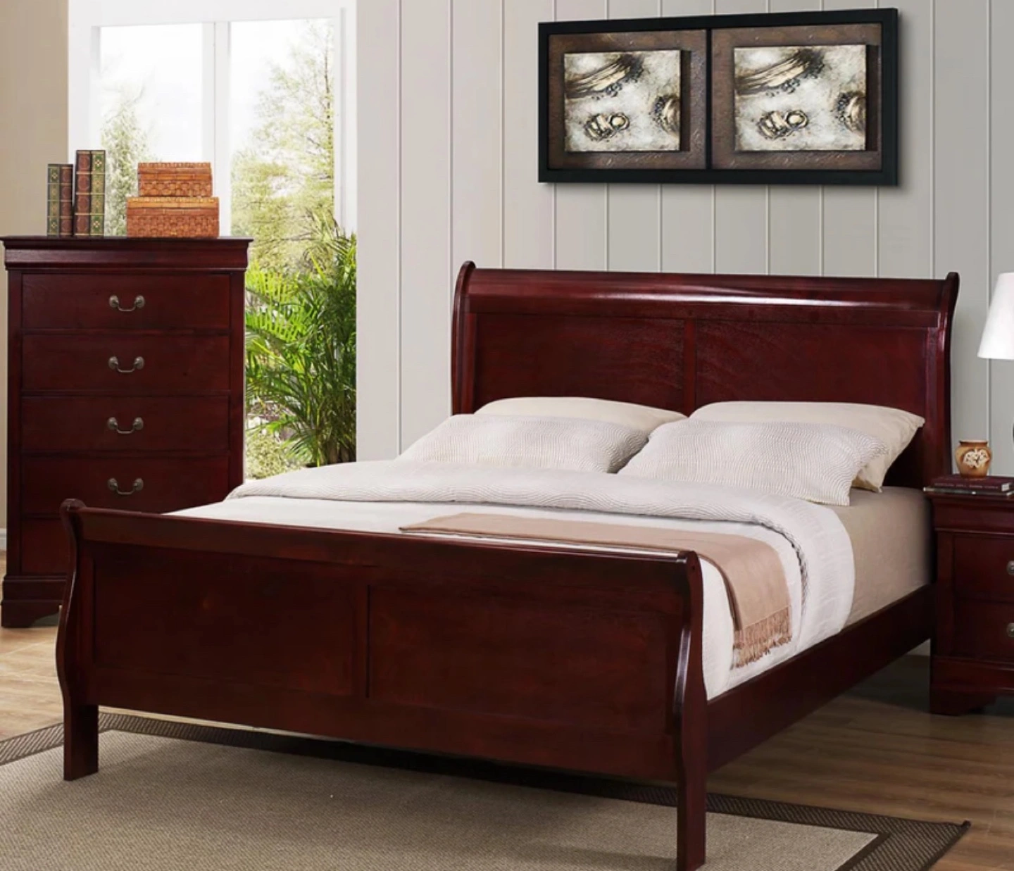Selling a queen-size sleigh bed frame. It's a beautiful piece of furniture that would look great in any bedroom. This bed frame is made of wood and has a rich, dark finish. It's in good condition and ready for a new home