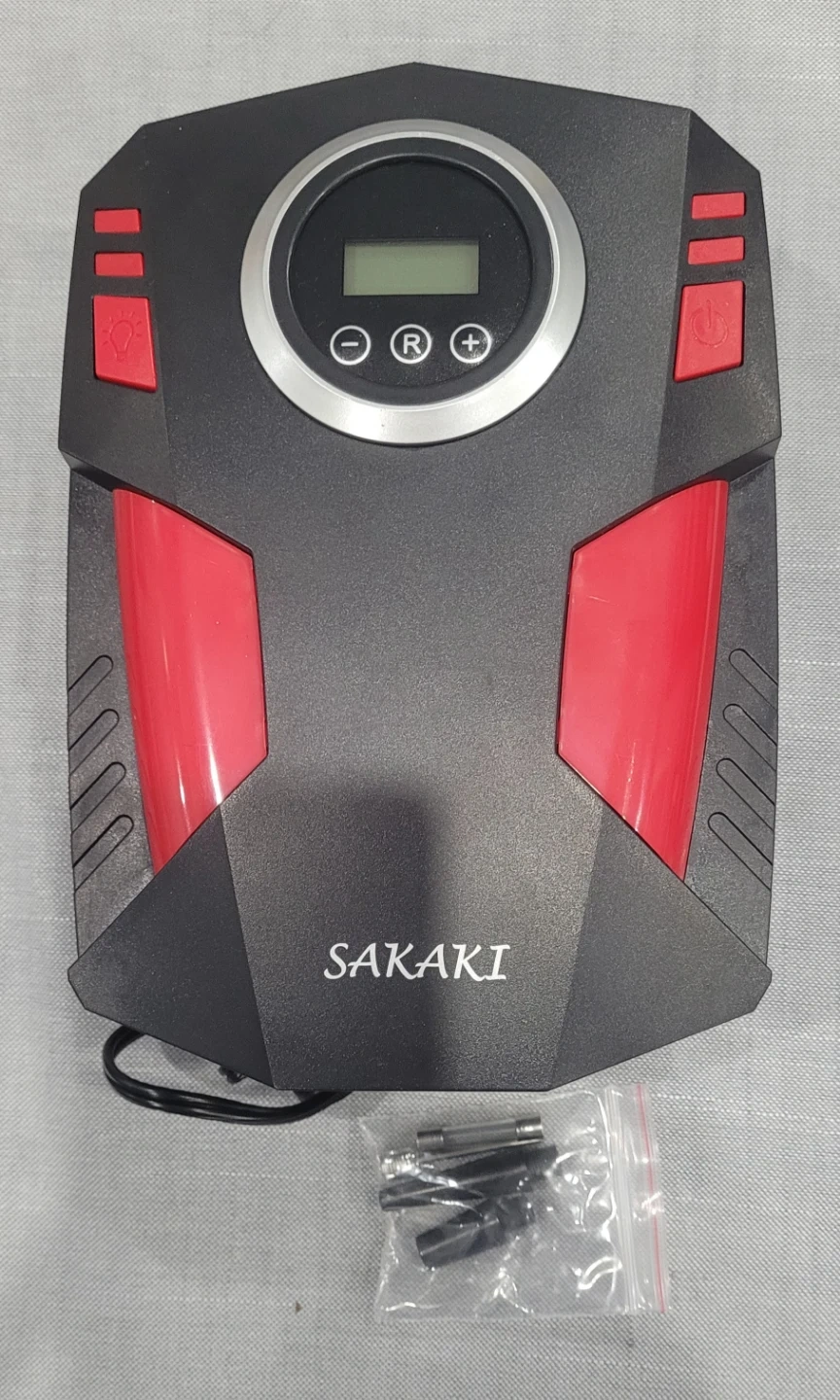 I'm selling a new Sakaki multifunctional air compressor, model YD-787, perfect for inflating tires and other inflatables. It's a single-cylinder air pump with a rated voltage of DC 12V, power of 120W, and a max current of 10A. It can handle a max air pressure of 150psi and has a flow rate of 35L/min. The cord length is 3.0m, and the air hose length is 50cm.