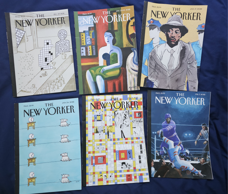 12 The New Yorker magazines up for grabs. Issues from Dec 27, 2021 to March 28, 2022. Doing a little spring cleaning and just clearing up some space
