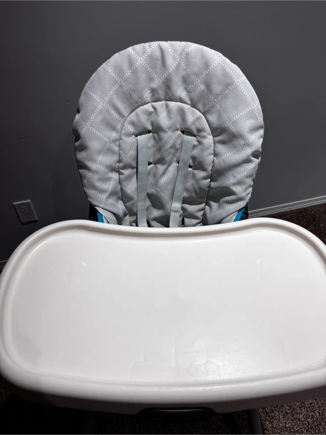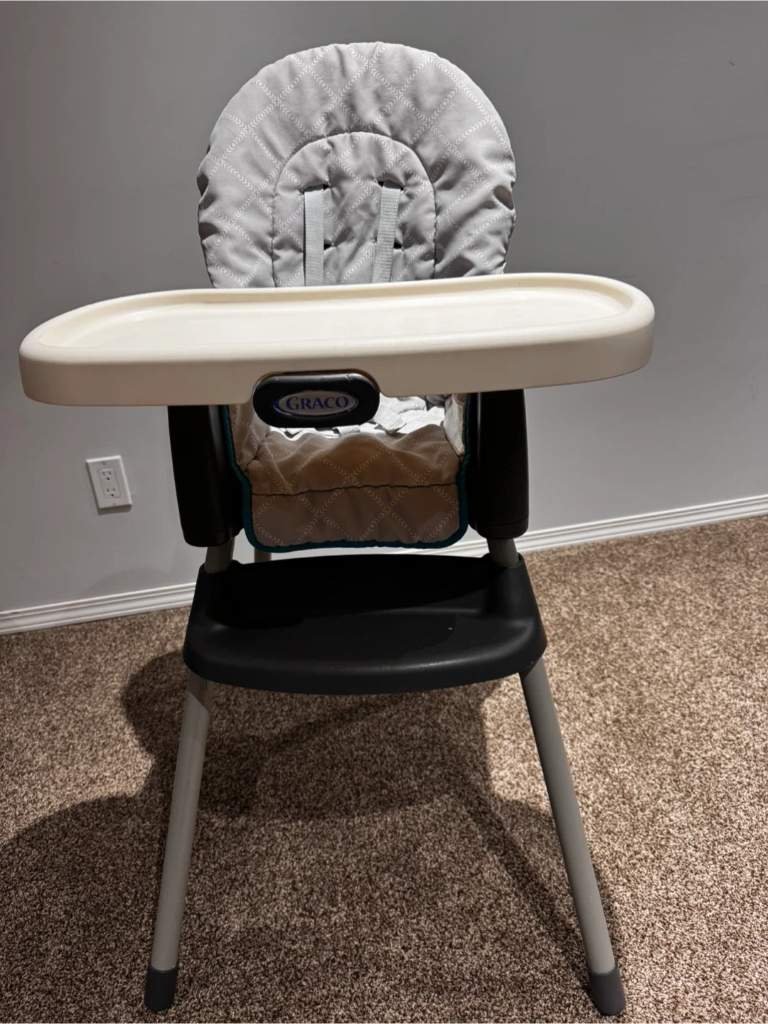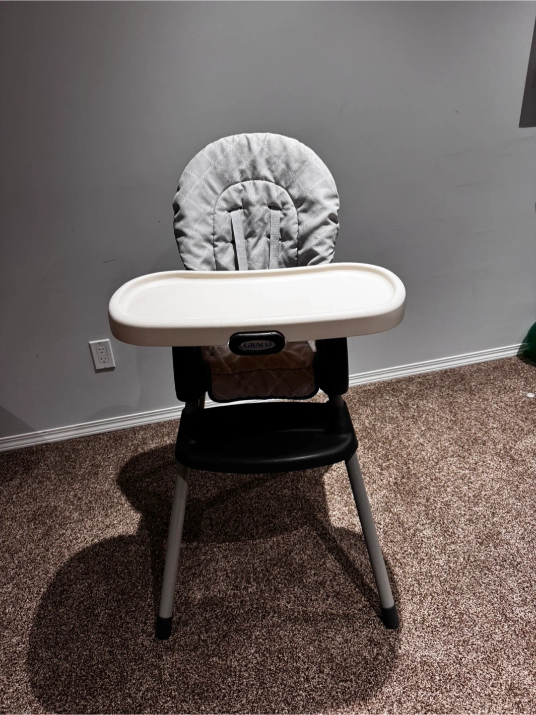 This is a Graco brand high chair. It features a padded grey seat with a patterned design and a removable white tray. The chair has a 5-point harness for safety.