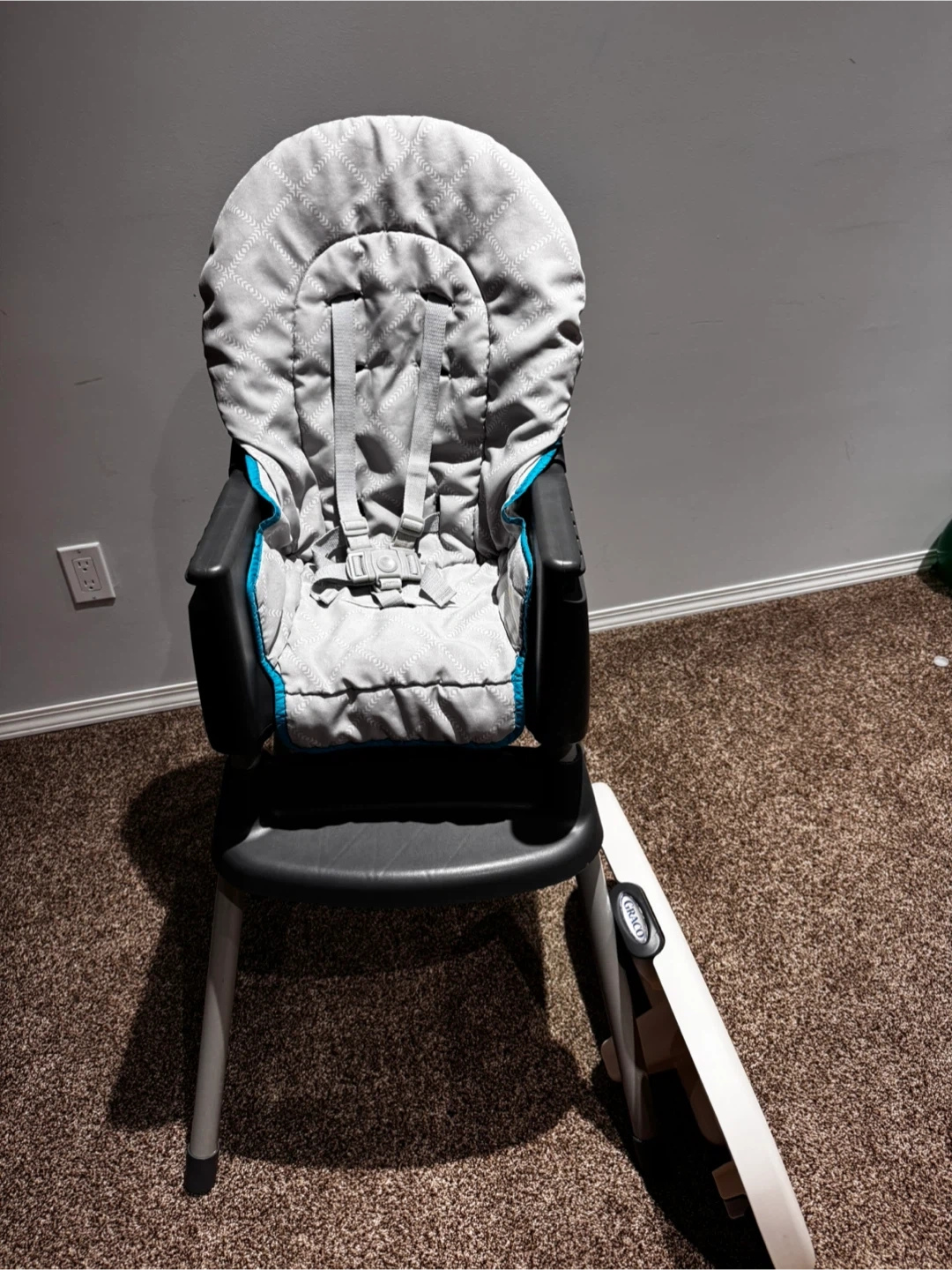This is a Graco brand high chair. It features a padded grey seat with a patterned design and a removable white tray. The chair has a 5-point harness for safety.