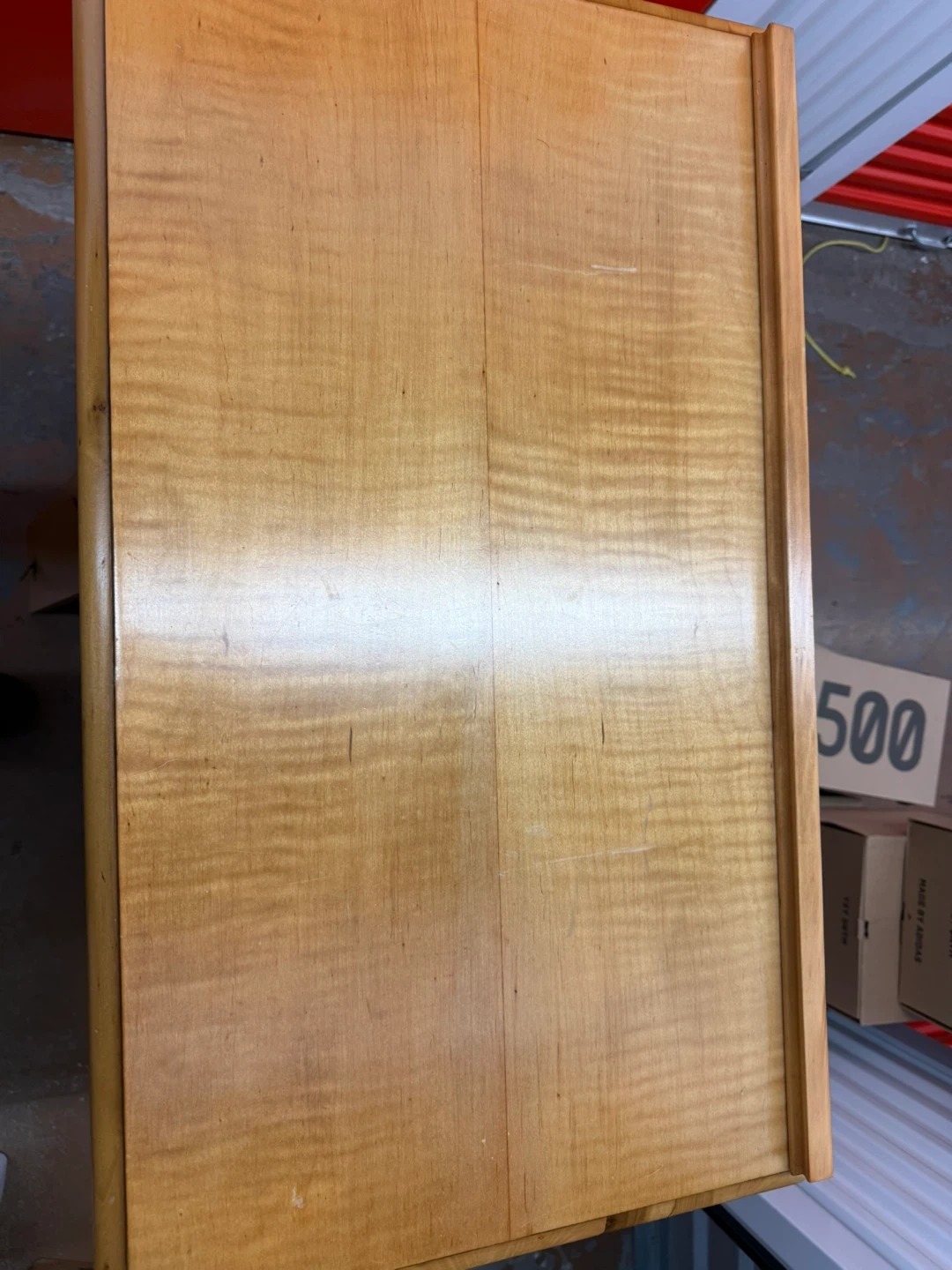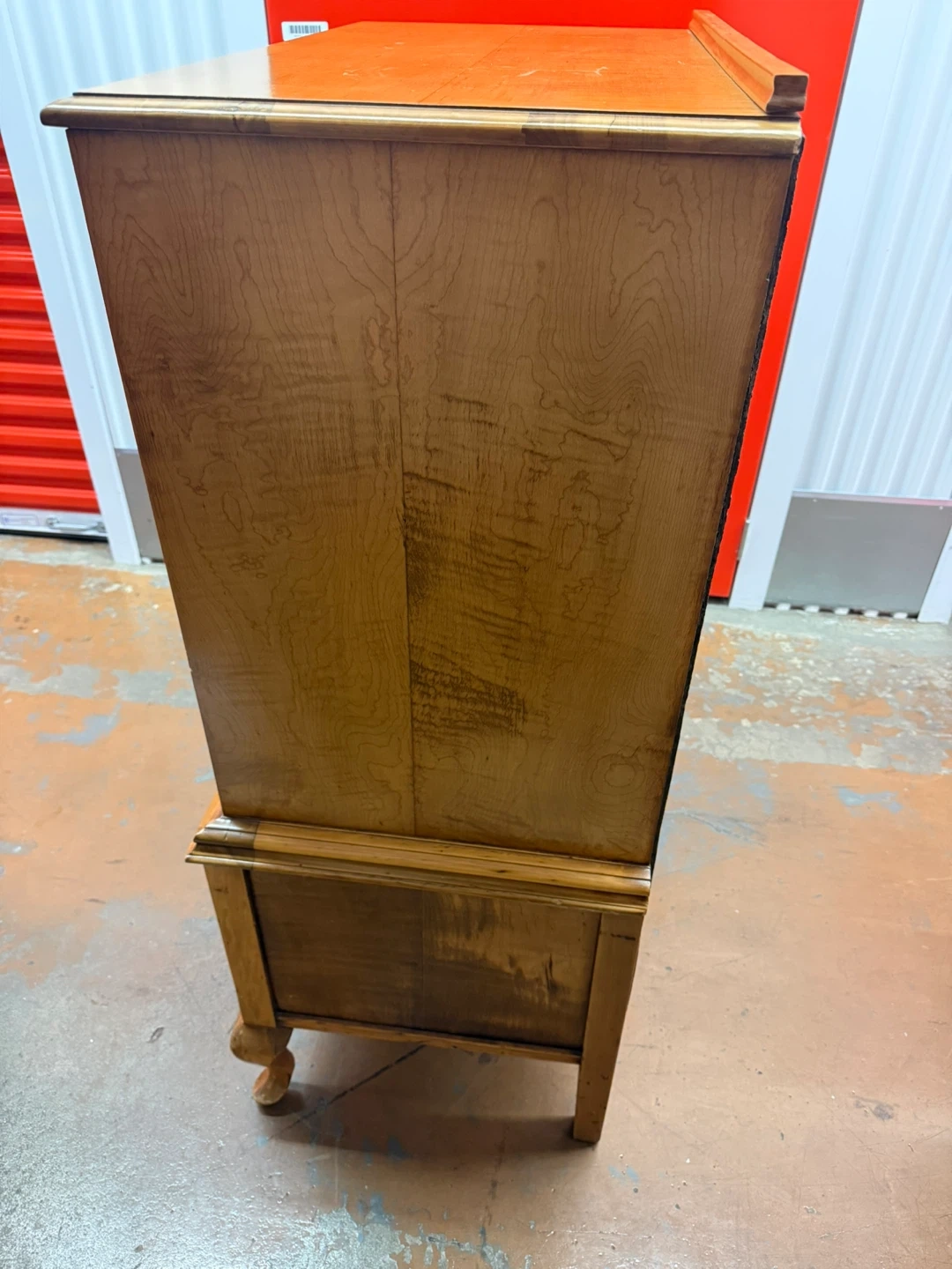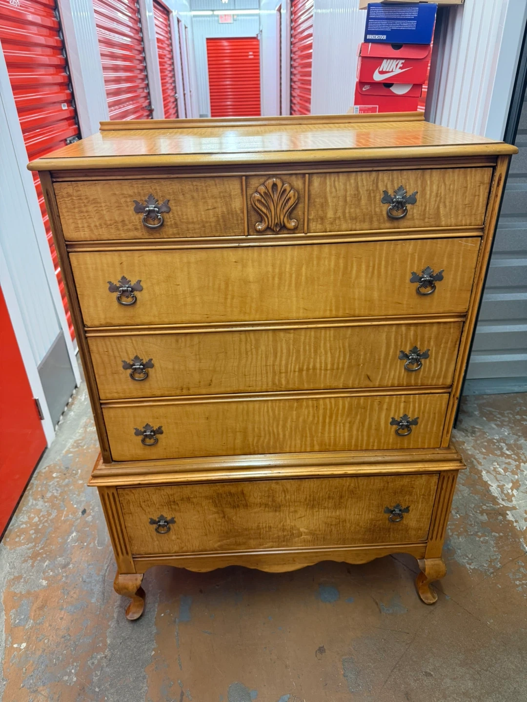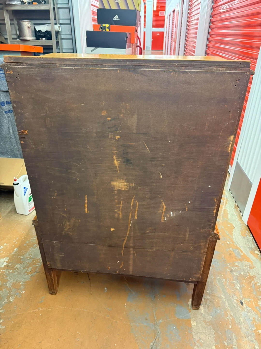 Selling a wooden dresser chest. It has a unique wood grain pattern and antique-style drawer pulls. One of the drawer fronts has become detached, but it is included and can be reattached