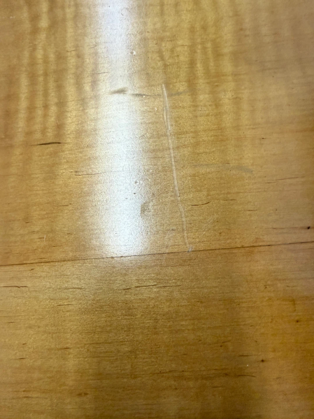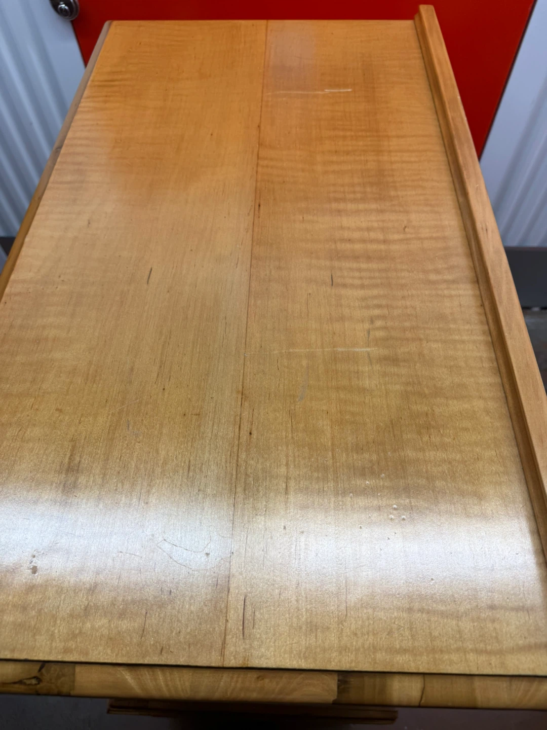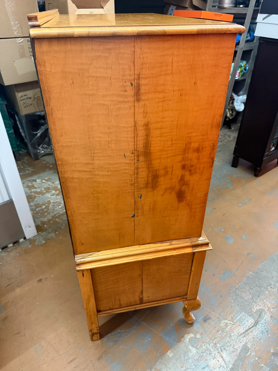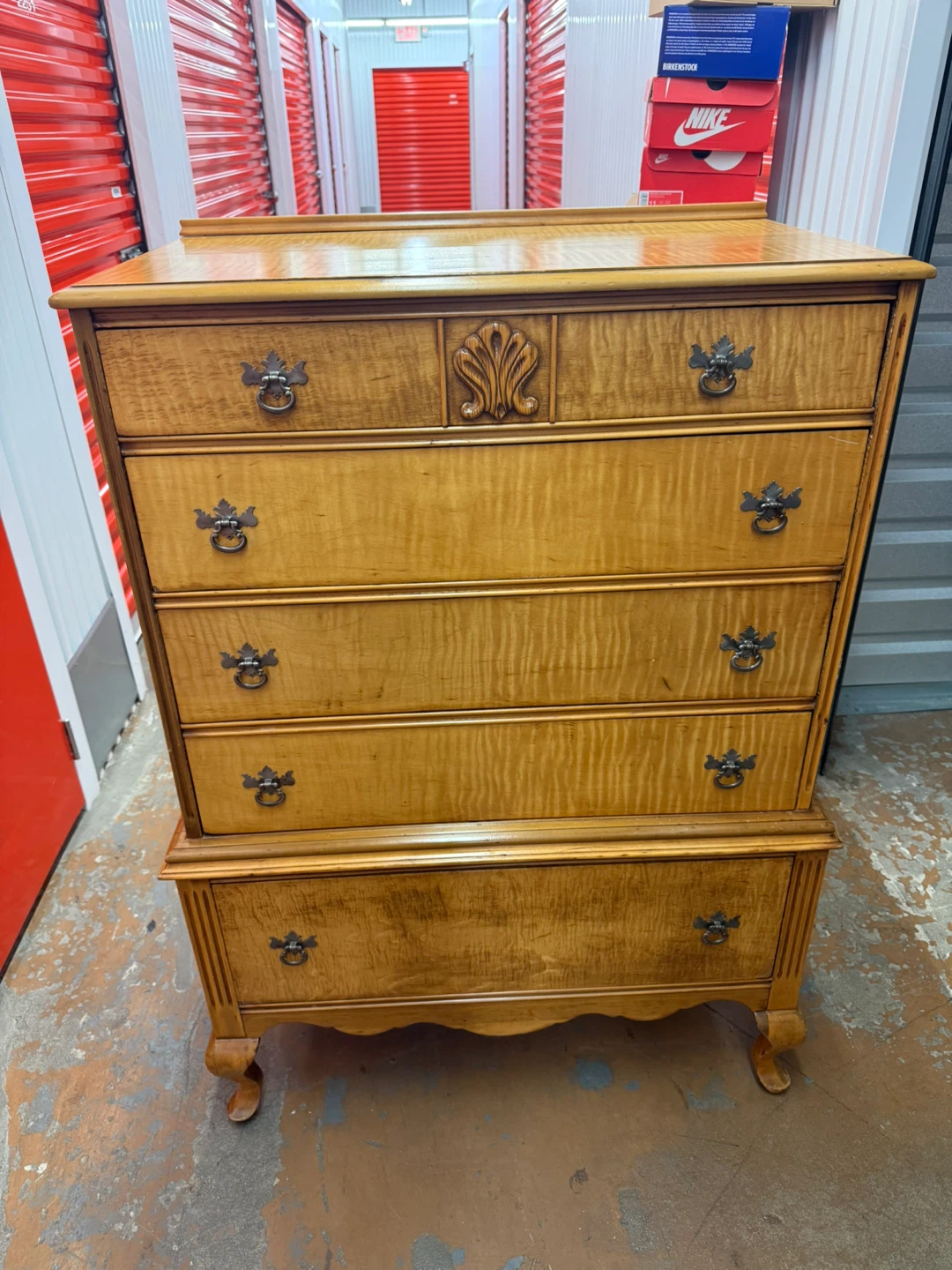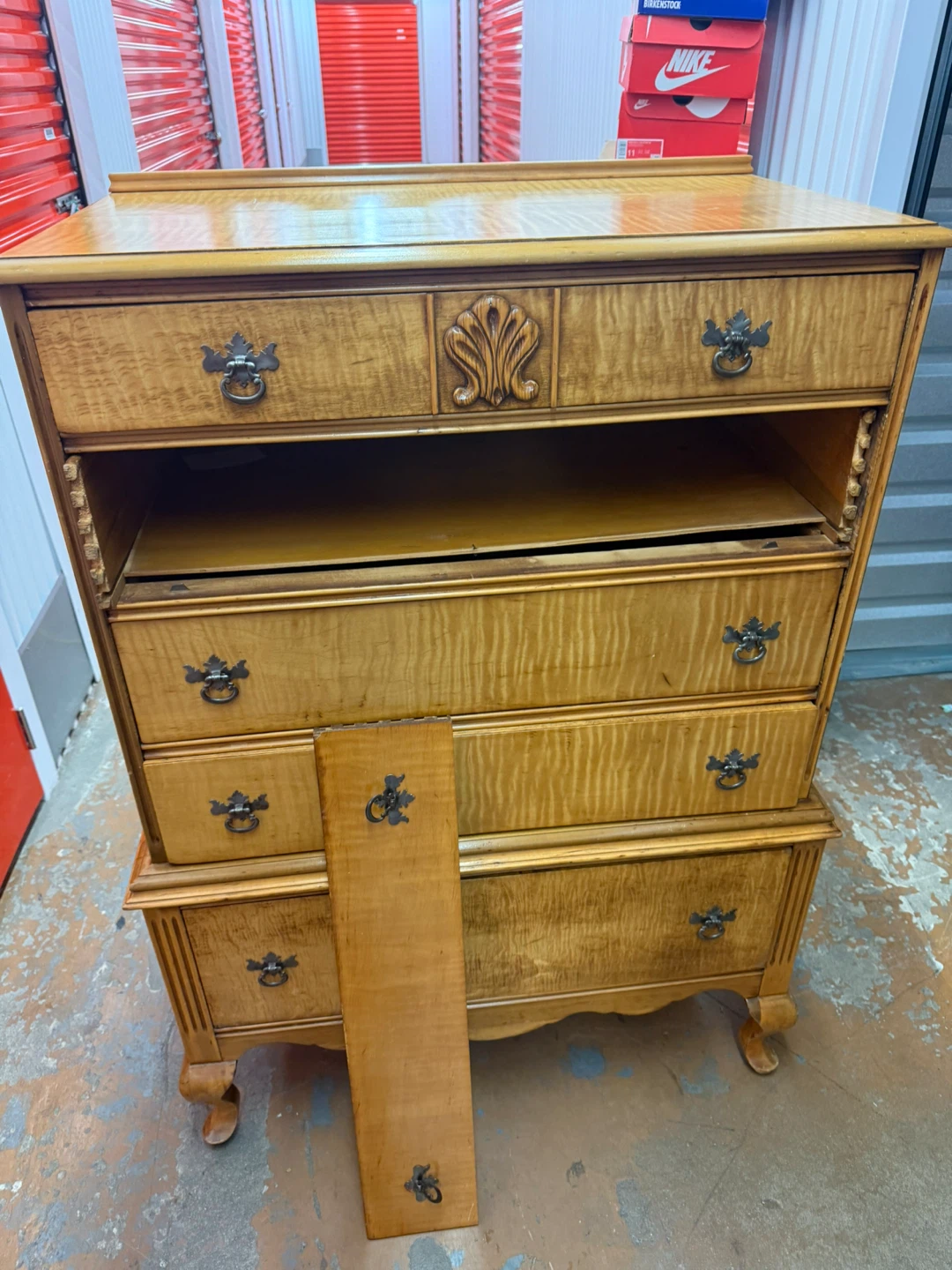 Selling a wooden dresser chest. It has a unique wood grain pattern and antique-style drawer pulls. One of the drawer fronts has become detached, but it is included and can be reattached