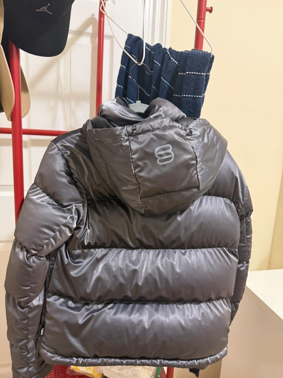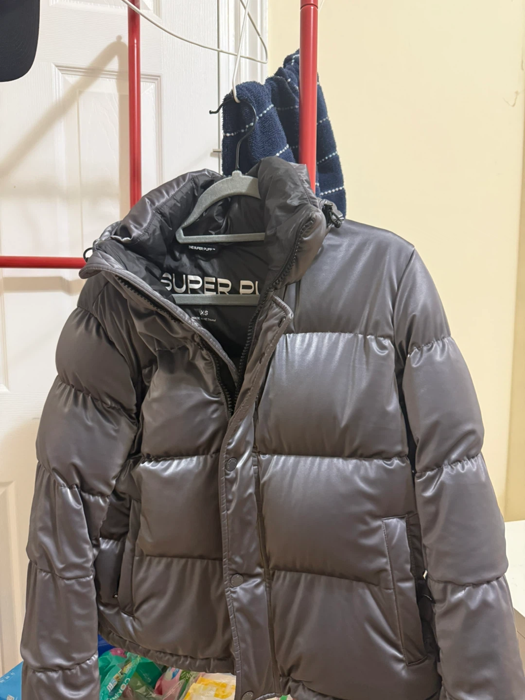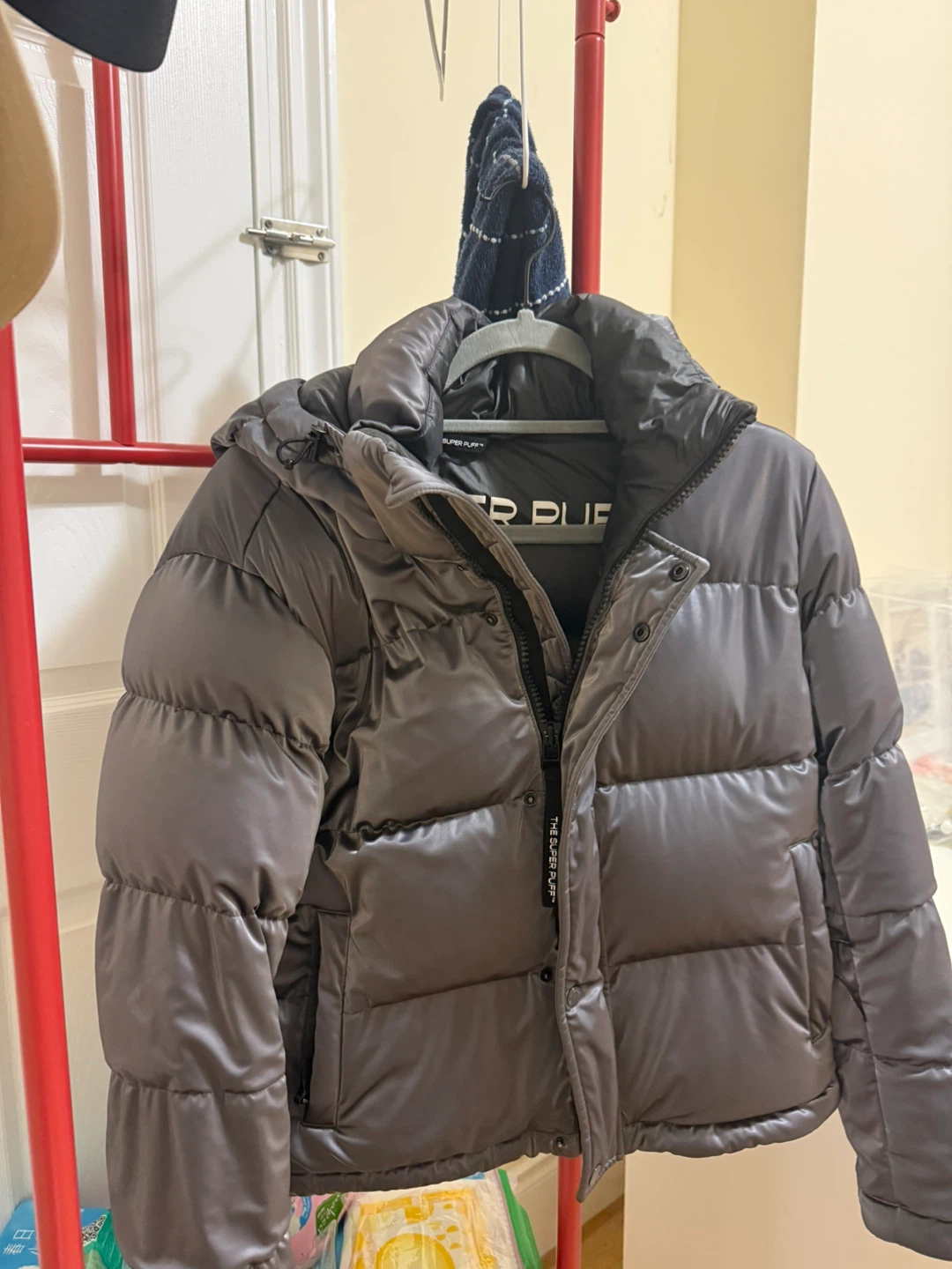 This is a grey, shiny puffer jacket from Aritzia's The Super Puff line. It's a warm, stylish winter coat. It zips up the front and has a hood for extra protection from the cold.