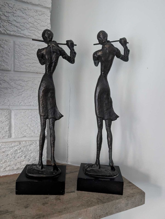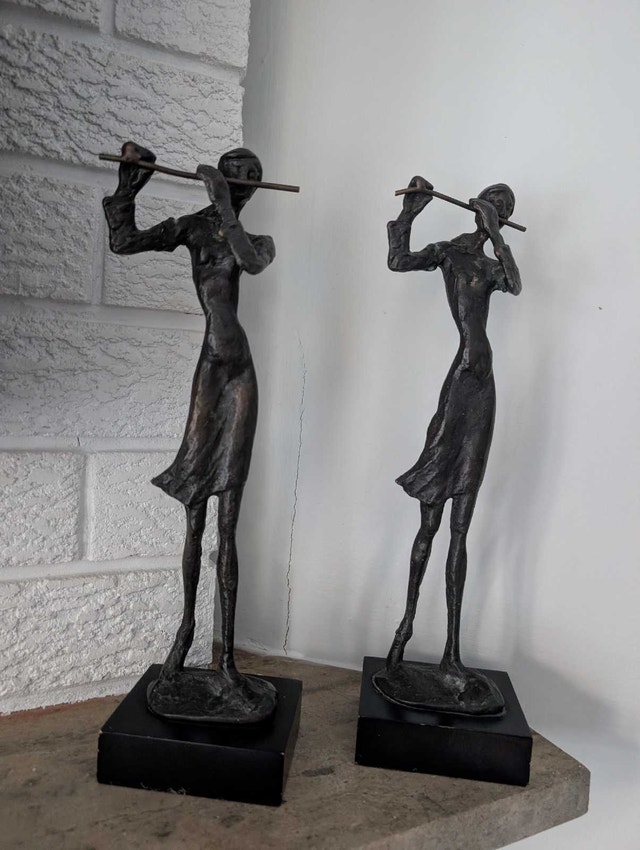 Add a touch of elegance to your home with these beautiful flute player bronze statues. These statues depict a slender figure playing the flute, rendered in a dark bronze finish. If the ad is up, they're still available! Don't miss out on this opportunity to own a unique art piece. Cashless payment accepted.