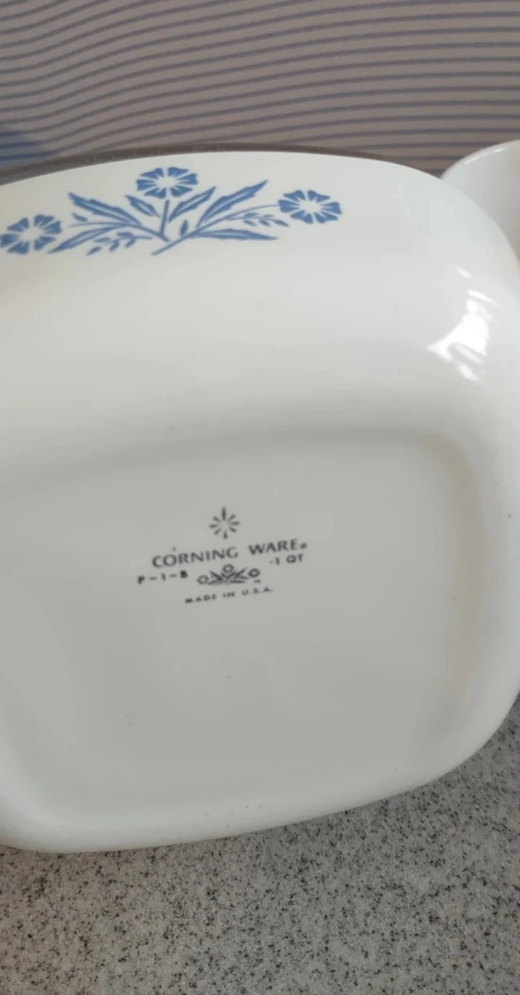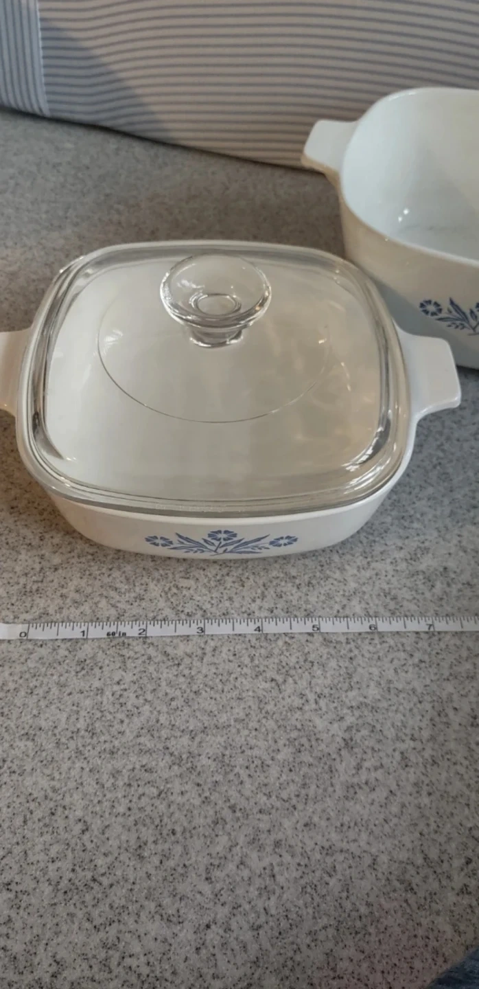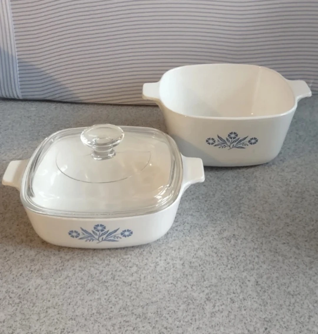 This is a classic CorningWare casserole dish in the blue cornflower pattern. It's made of durable pyroceram and includes a clear glass lid. This 1-quart dish is perfect for baking or serving small dishes. It's made in the U.S.A.!