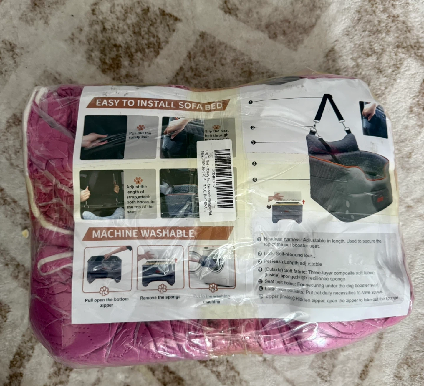 This dog car seat is made with a three-layer composite soft fabric outside and high resilience sponge inside. It's machine washable and features an adjustable headrest harness and pet leash. It also has seat belt holes for securing the seat and large side pockets for pet necessities.