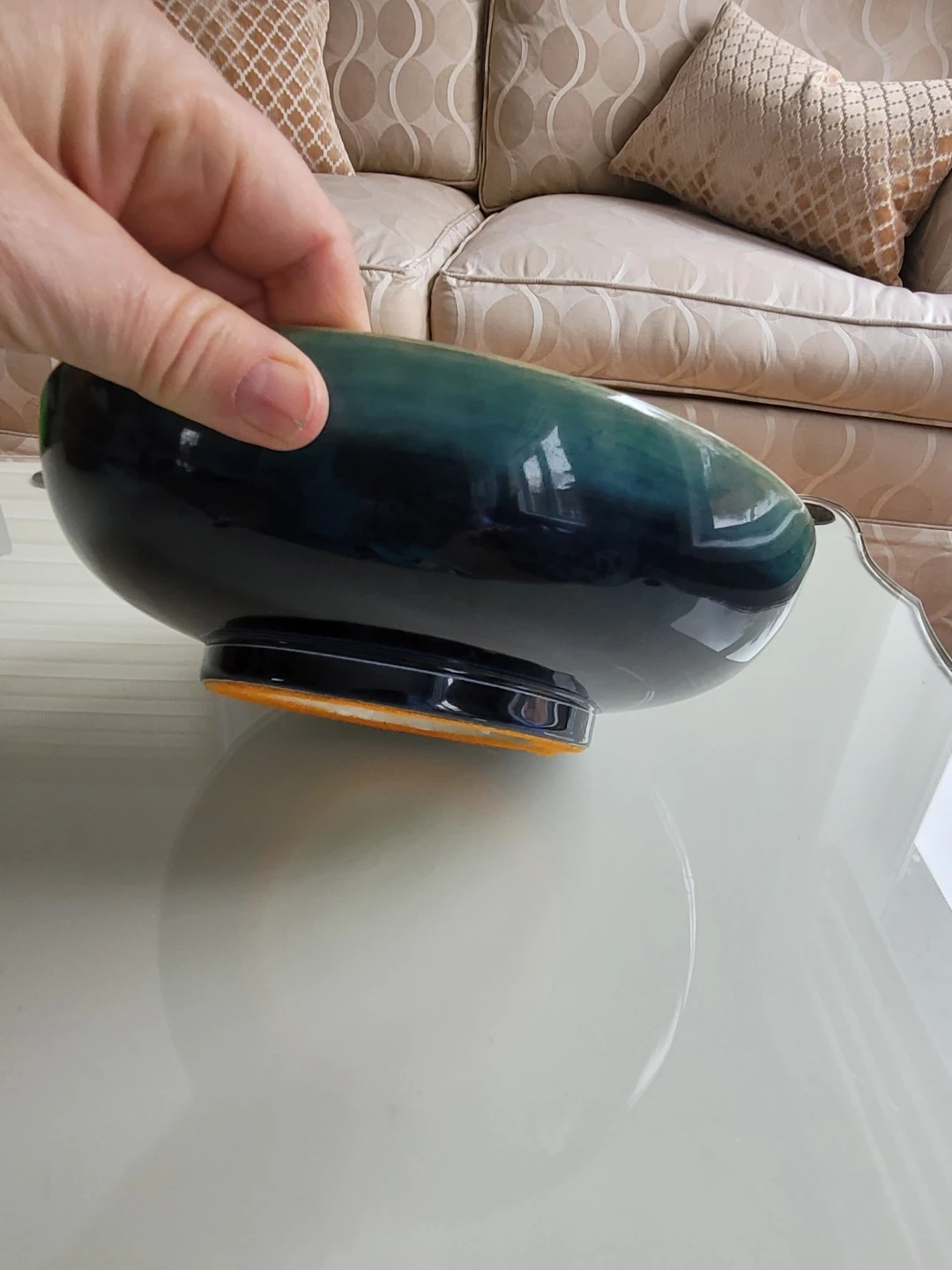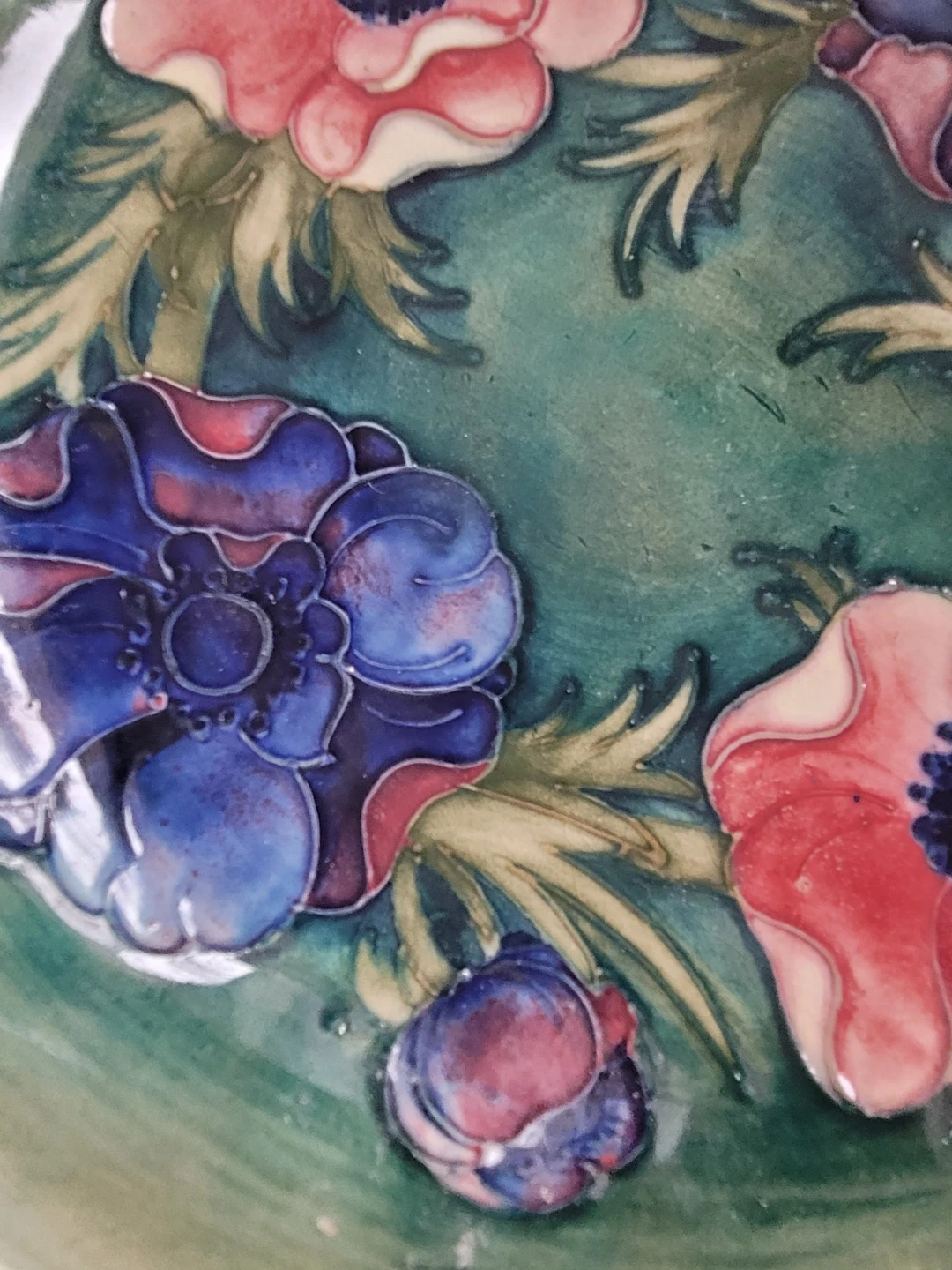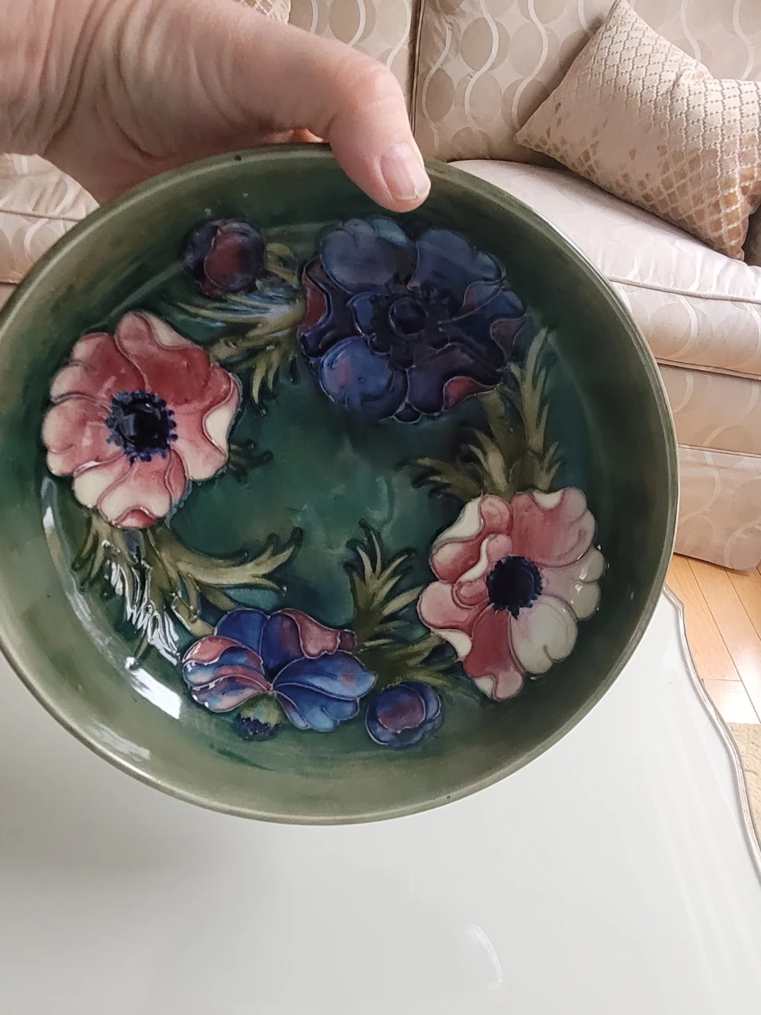 Vintage "MOORECROFT" Japanese Anemones pattern bowl It has a glossy dark green & navy exterior and a patterned floral interior. Signed on base both Green and Blue. I think this one is by the father William as the color pallet is older?