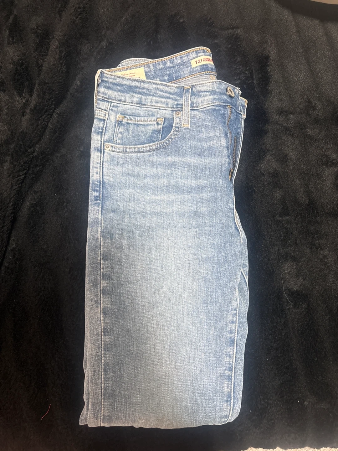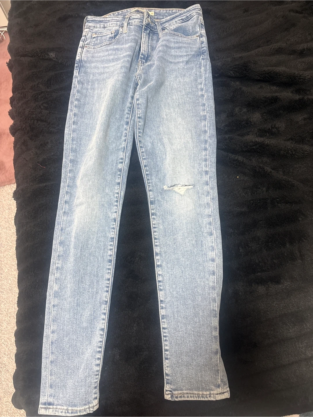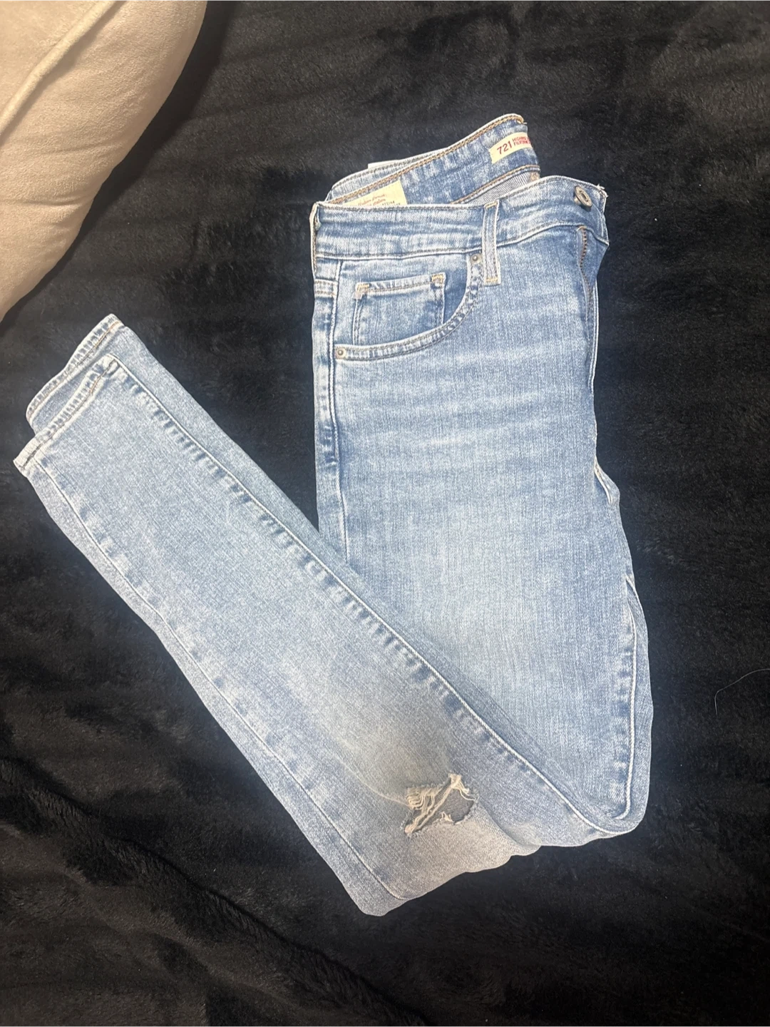 Classic light wash Levi's 721 jeans with a high rise and skinny fit. Features a ripped detail on the left knee. Comfortable denim for everyday wear. Pick up cash only