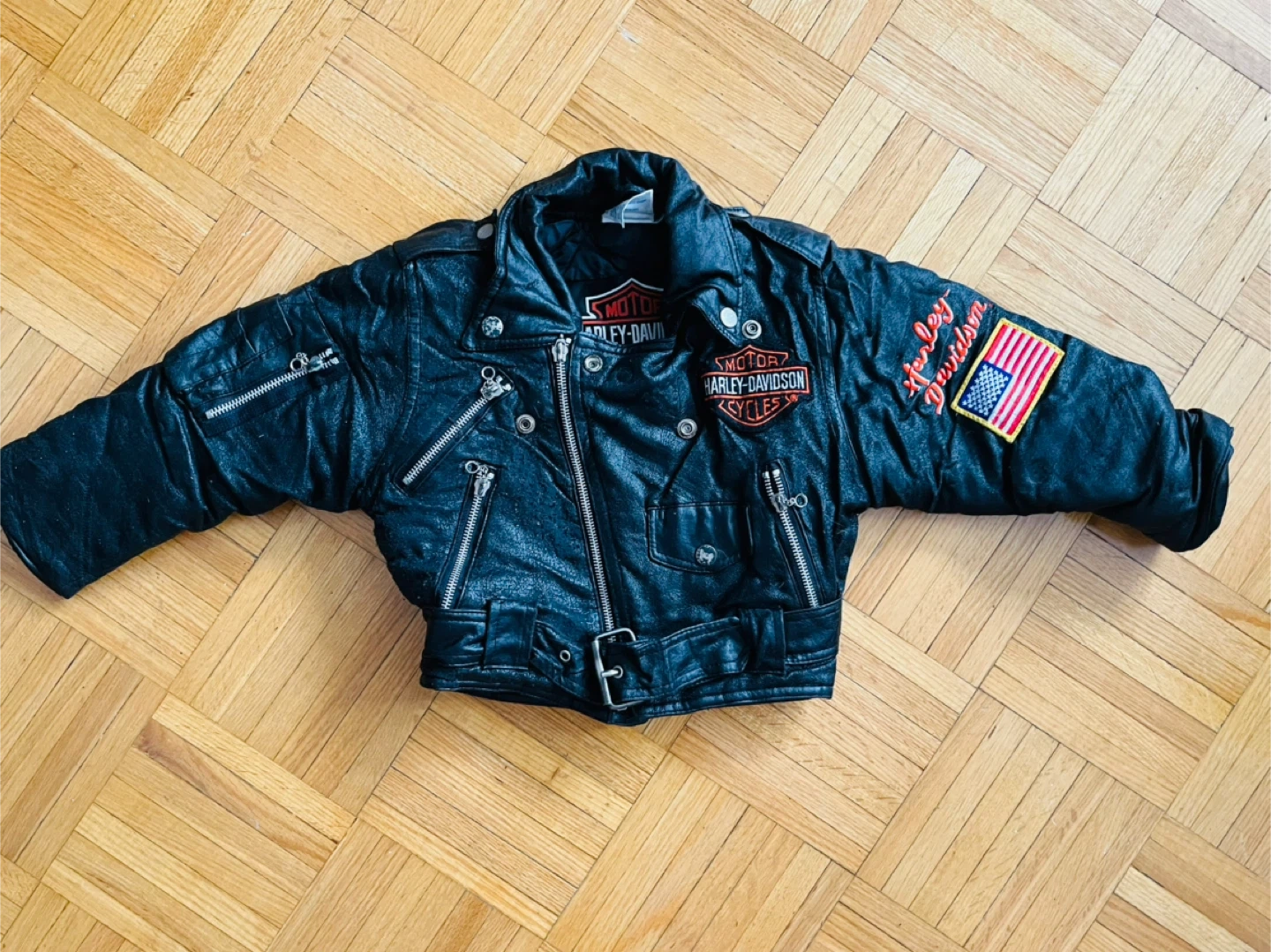 Harley-Davidson kids leather jacket, perfect for your little biker! It's in great condition and features the classic Harley-Davidson logo on the back and front. There's also an American flag patch on the sleeve. A super cool jacket for any kid!