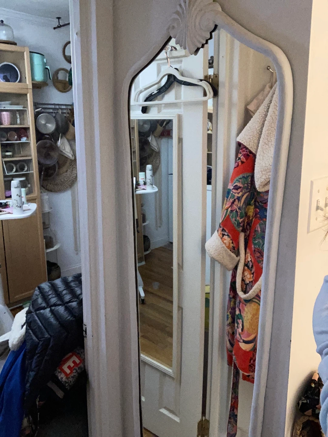 This ornate wall mirror has a white frame with decorative detailing. It measures approximately 52 inches in height and 19 inches in width. It's a beautiful accent piece for any room!