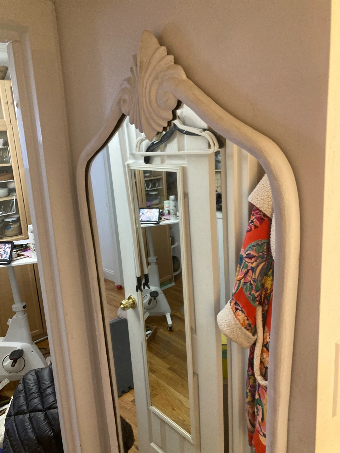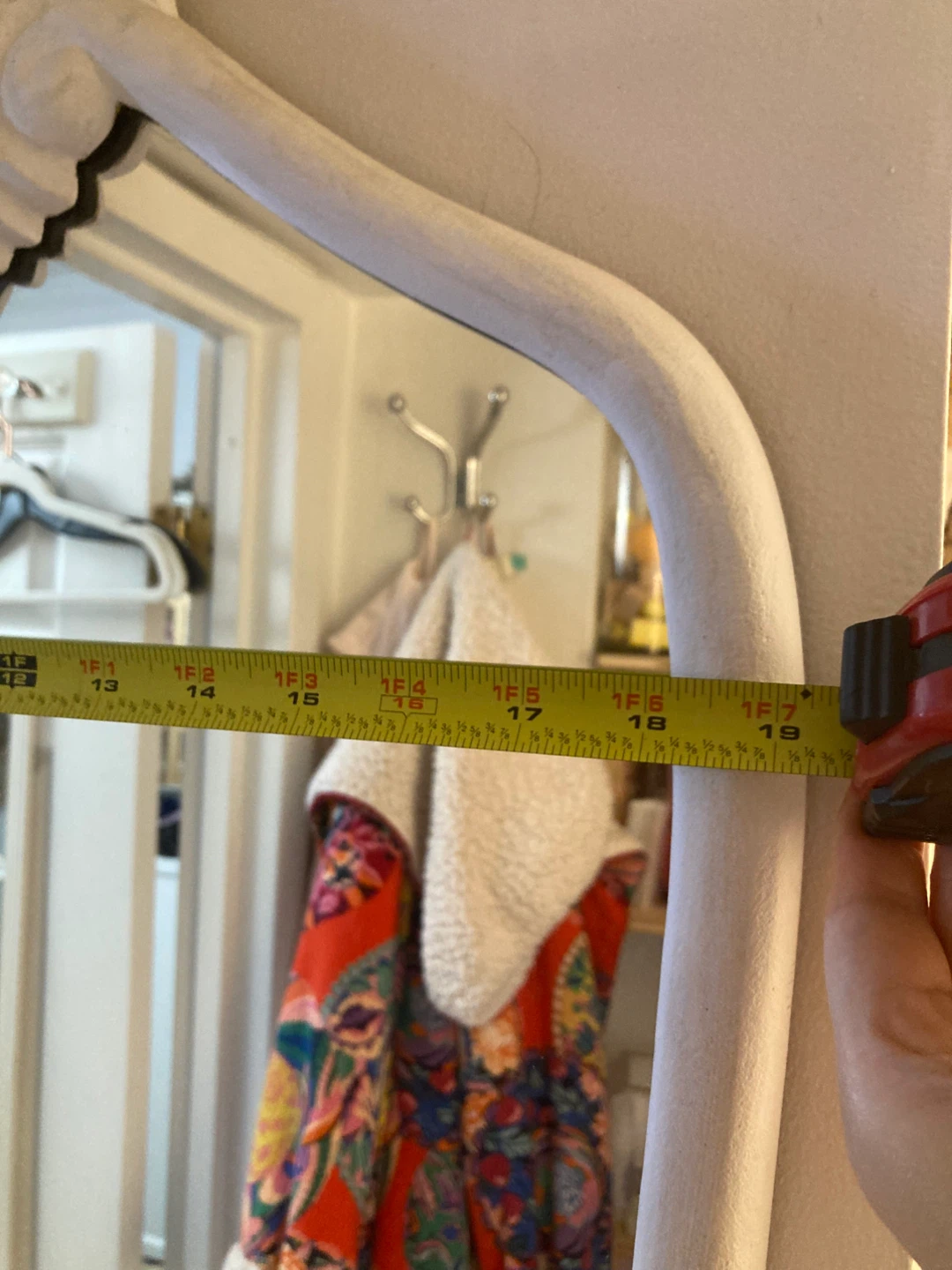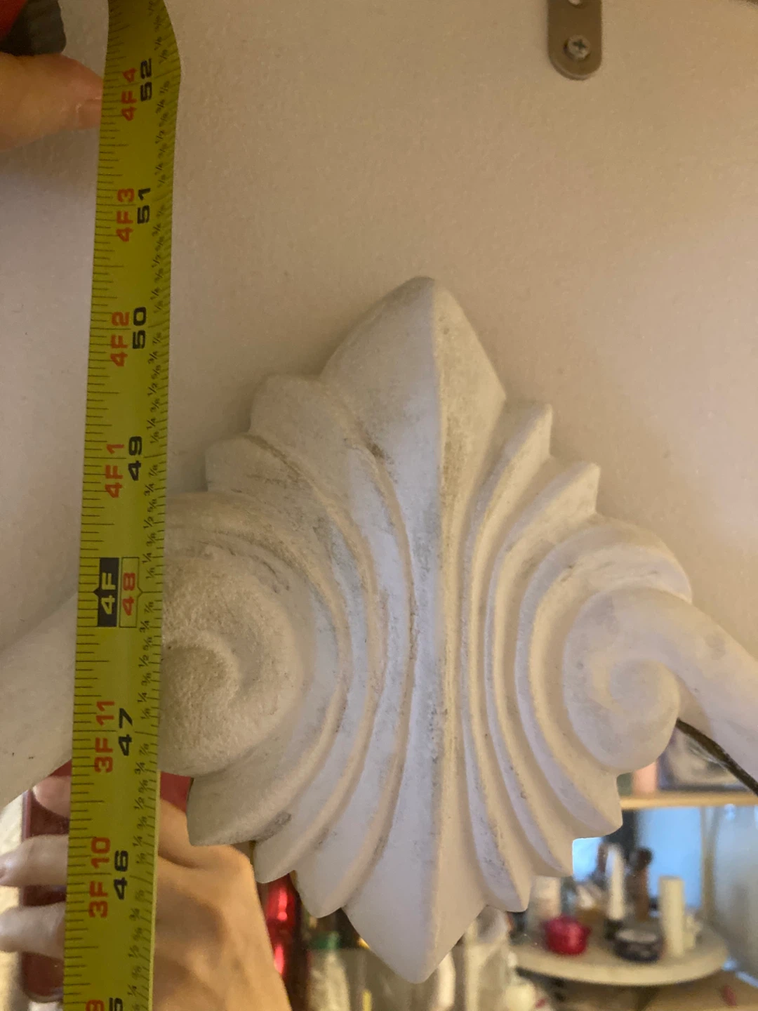 This ornate wall mirror has a white frame with decorative detailing. It measures approximately 52 inches in height and 19 inches in width. It's a beautiful accent piece for any room!
