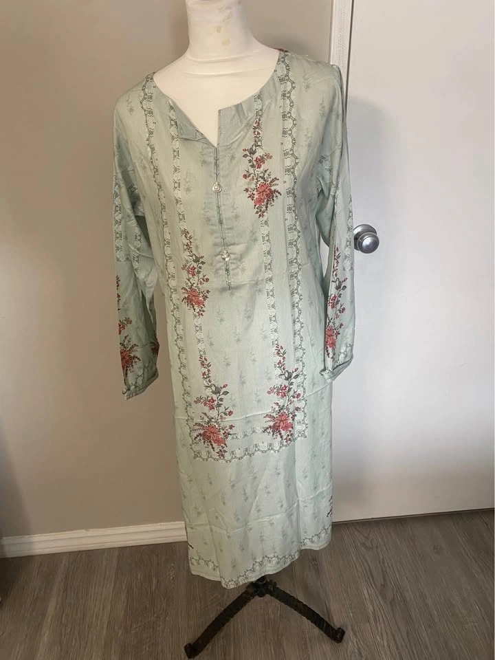 Selling a brand new 3-piece suit, including a top, bottom, and dupatta. Size medium with a chest measurement of 20.5 inches. The fabric is linen. This is a pretty 3-piece ethnic wear set in a light blue color with a floral print. The set features a long top, matching pants, and a matching linen dupatta. It looks very comfortable and stylish.