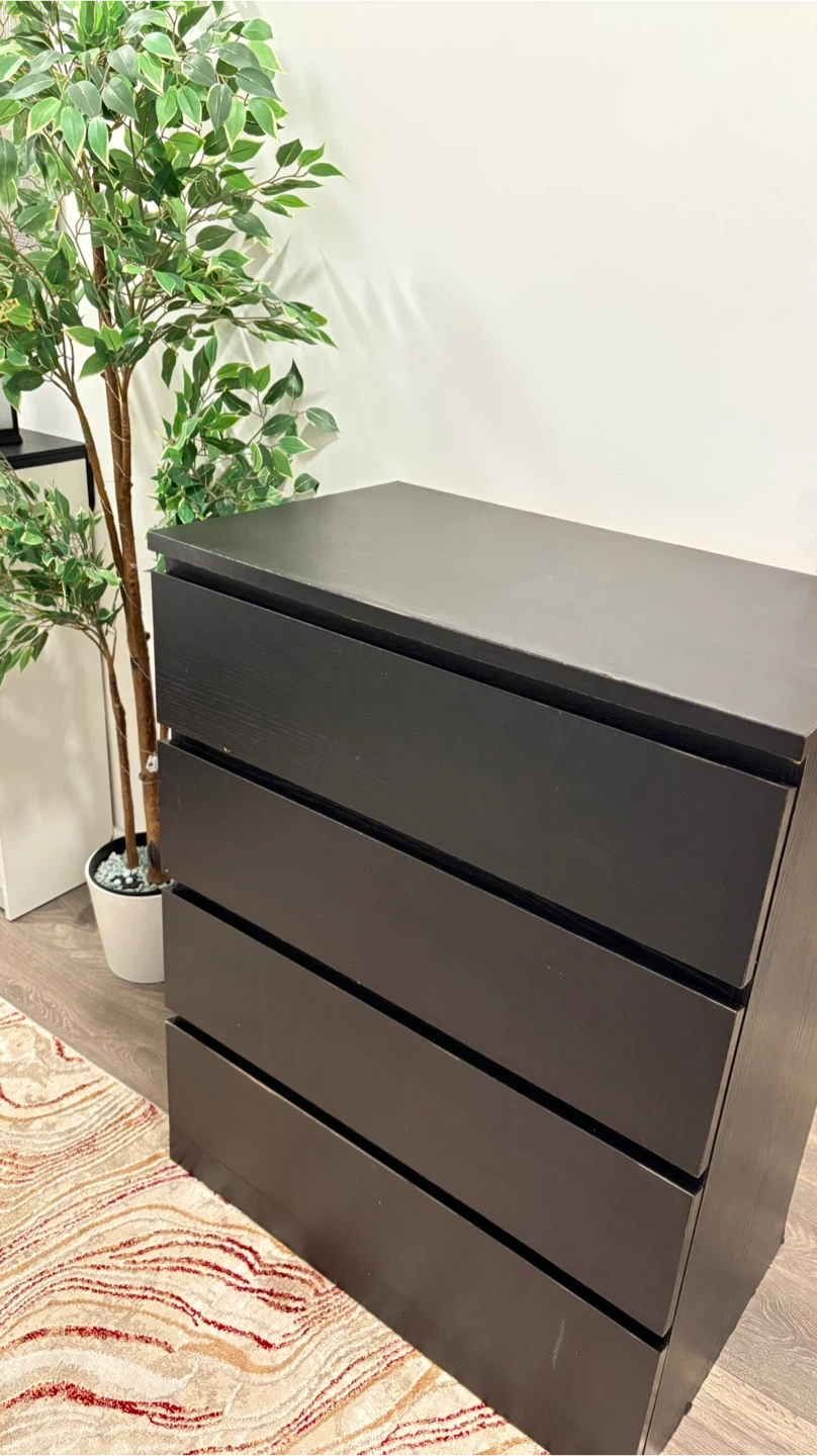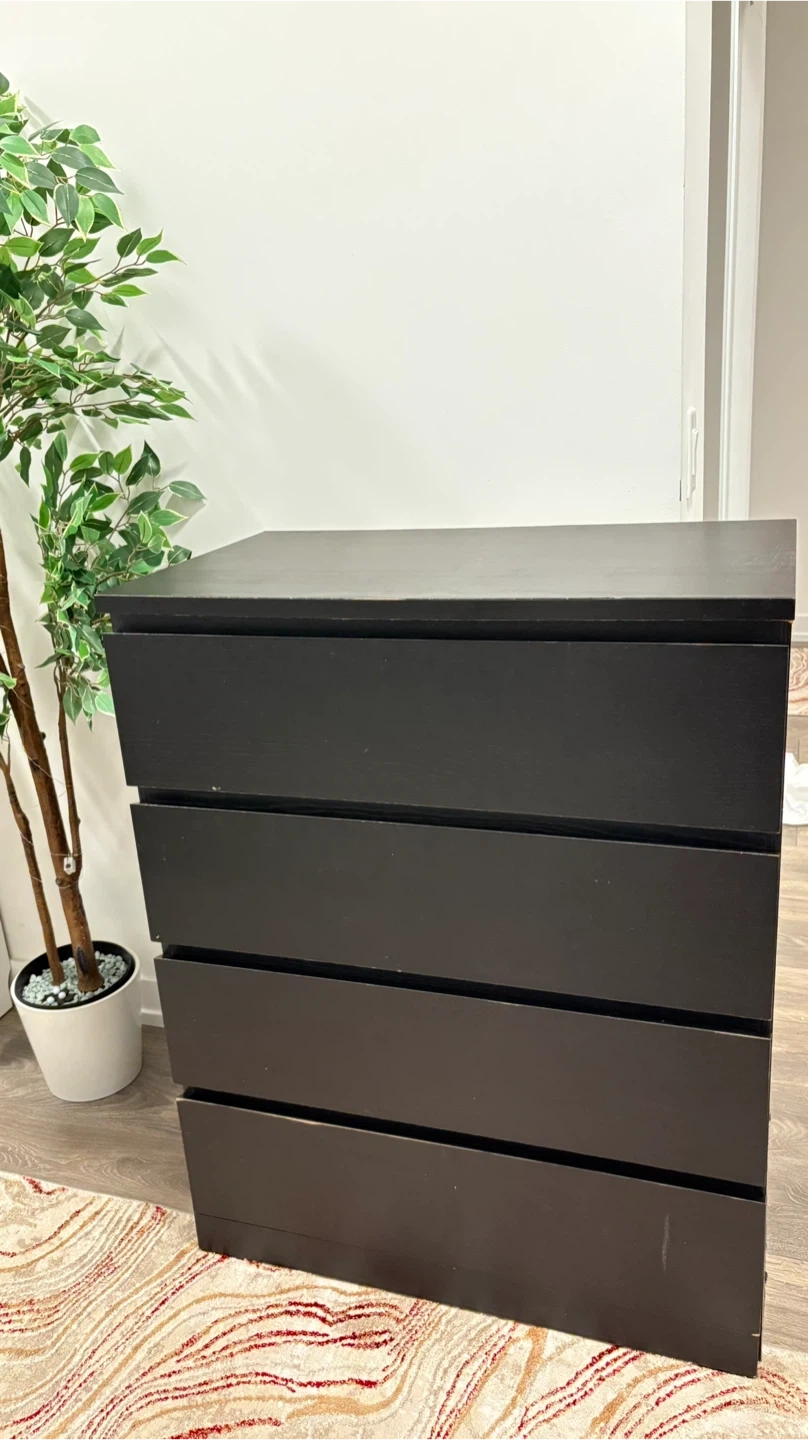 This is a black dresser with four drawers. It's a good size for a bedroom or closet. Plenty of storage space!