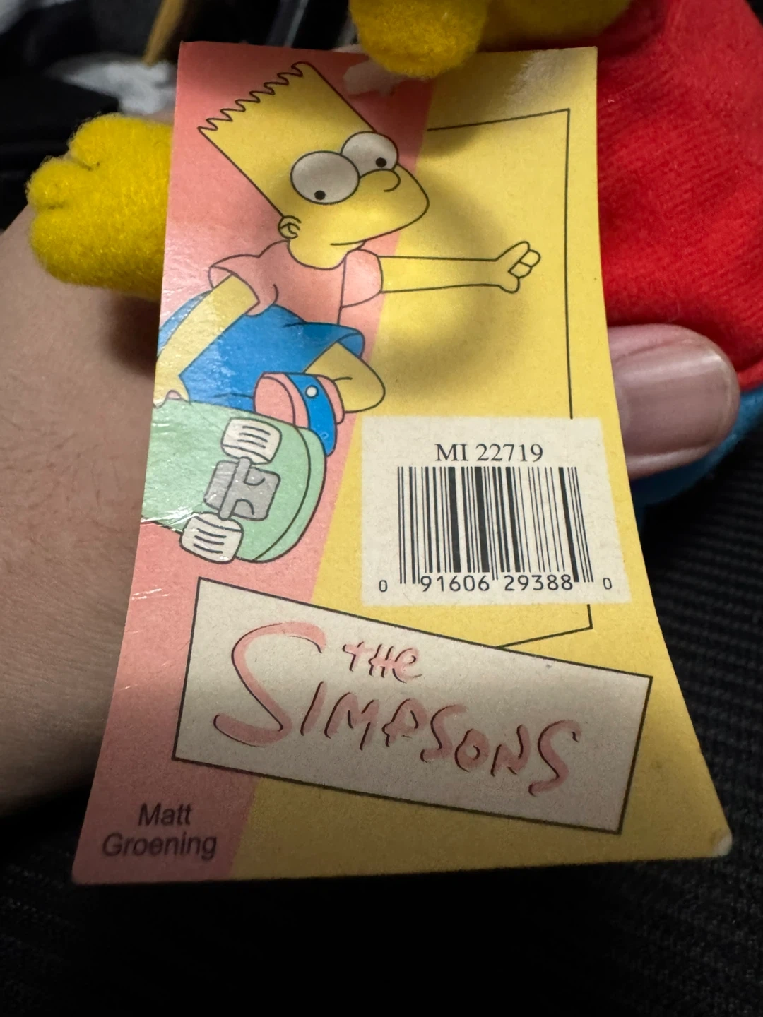 Yellow plush toy of Bart Simpson wearing a red shirt and blue shorts. Features a "The Simpsons" logo on the shirt and "Matt Groening" on the tag. Small to medium size.