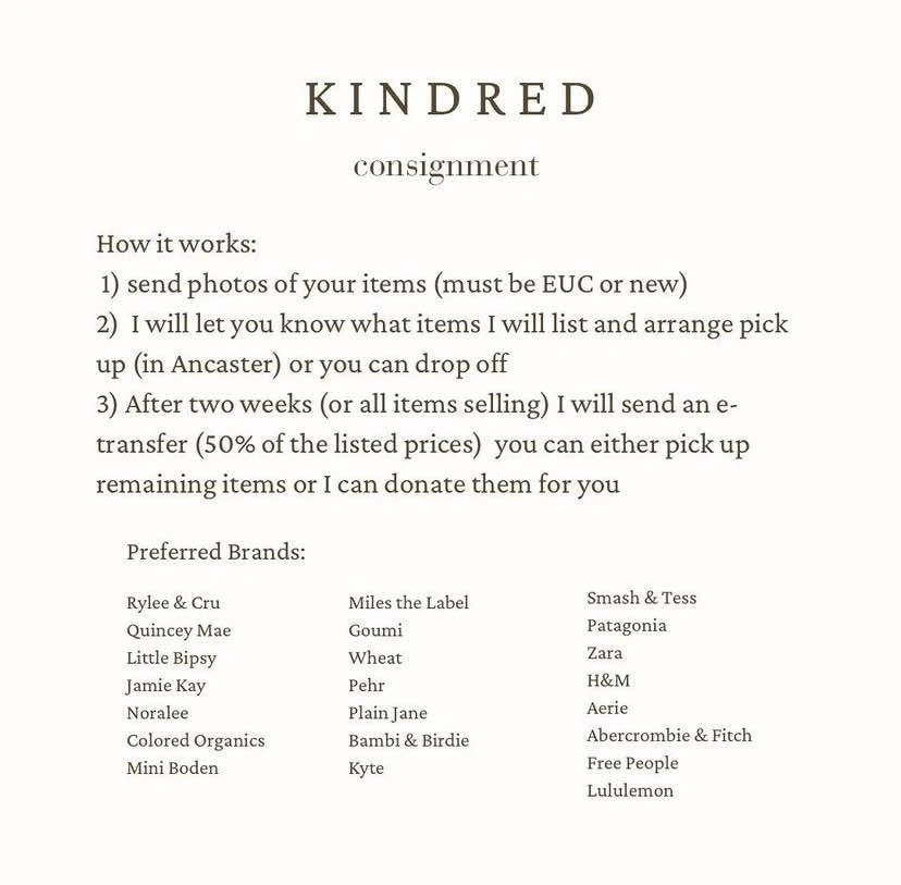 We are an online consignment shop located in Mississauga, taking on new clients! For more details head to the shop: www.instagram.com/shop__kindred or send us a message!