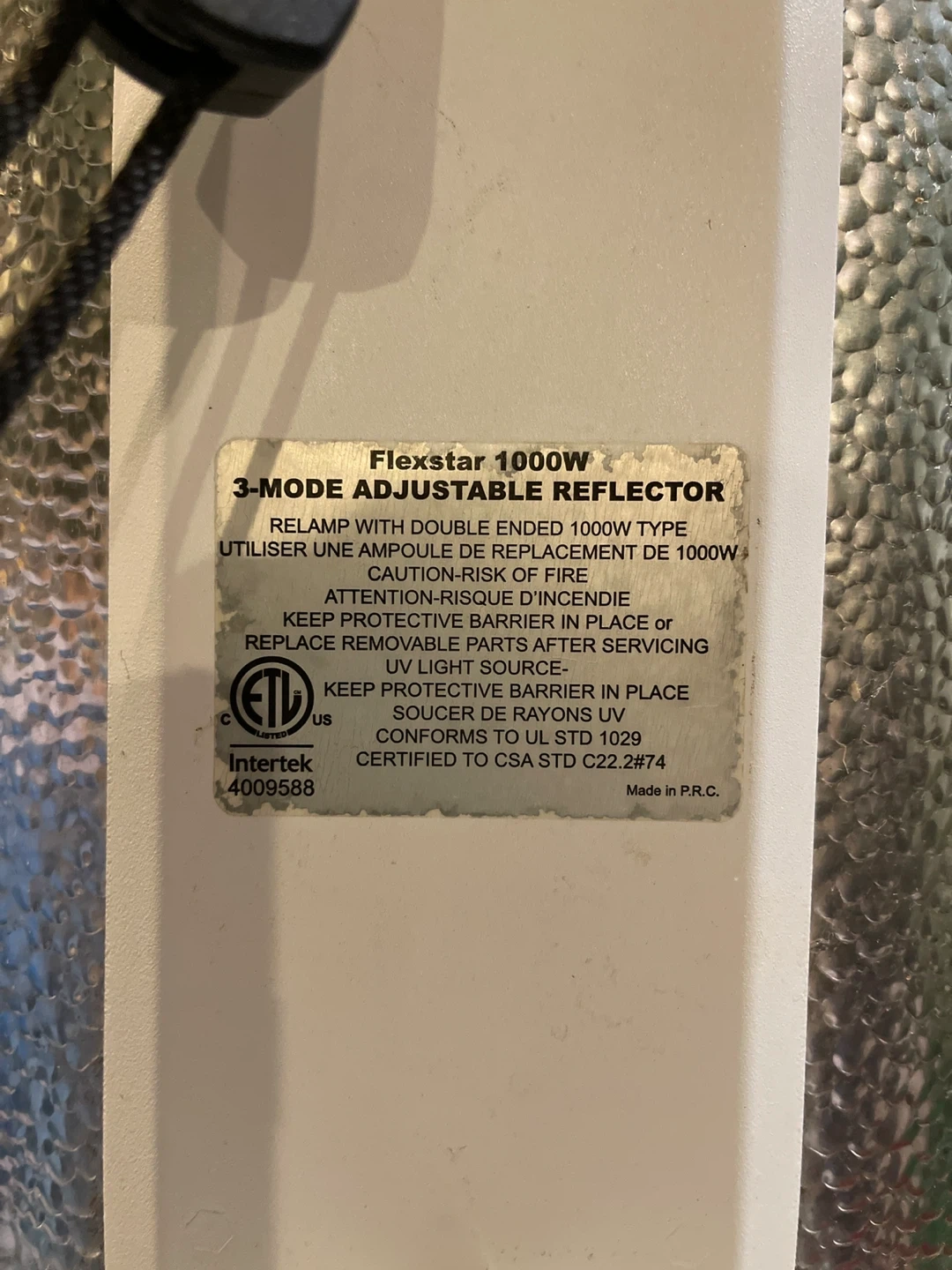 Selling a Grower's Flexstar 1000W adjustable reflector. It's a 3-mode adjustable reflector that uses a double-ended 1000W type UV light source.